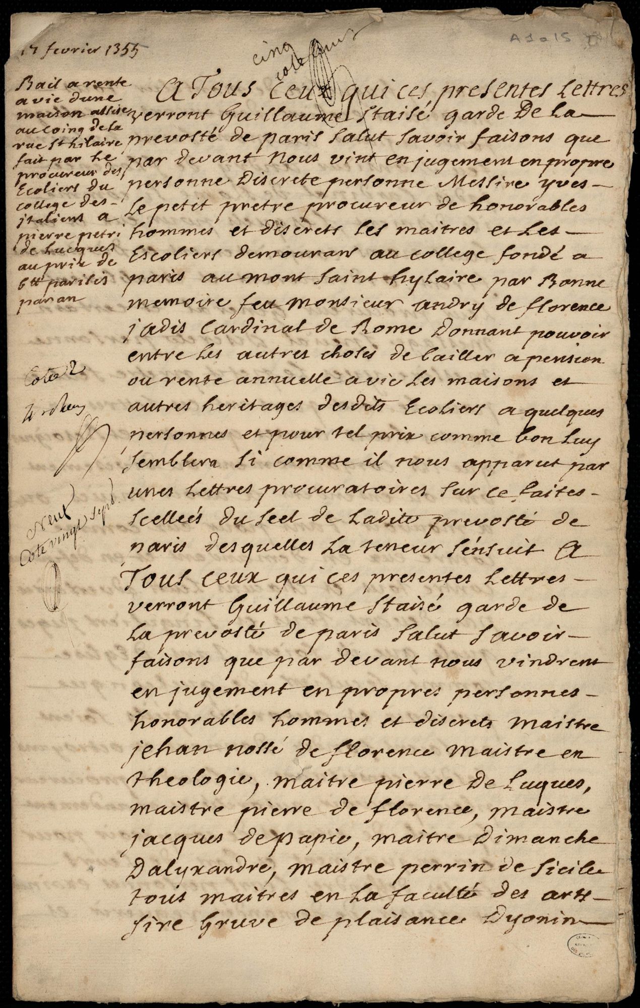 Copie d'un bail datant du 17 février 1356 n. st., concernant une maison sise au coin de la rue Saint-Hilaire du côté de l'hôtel de Blois, s.d.