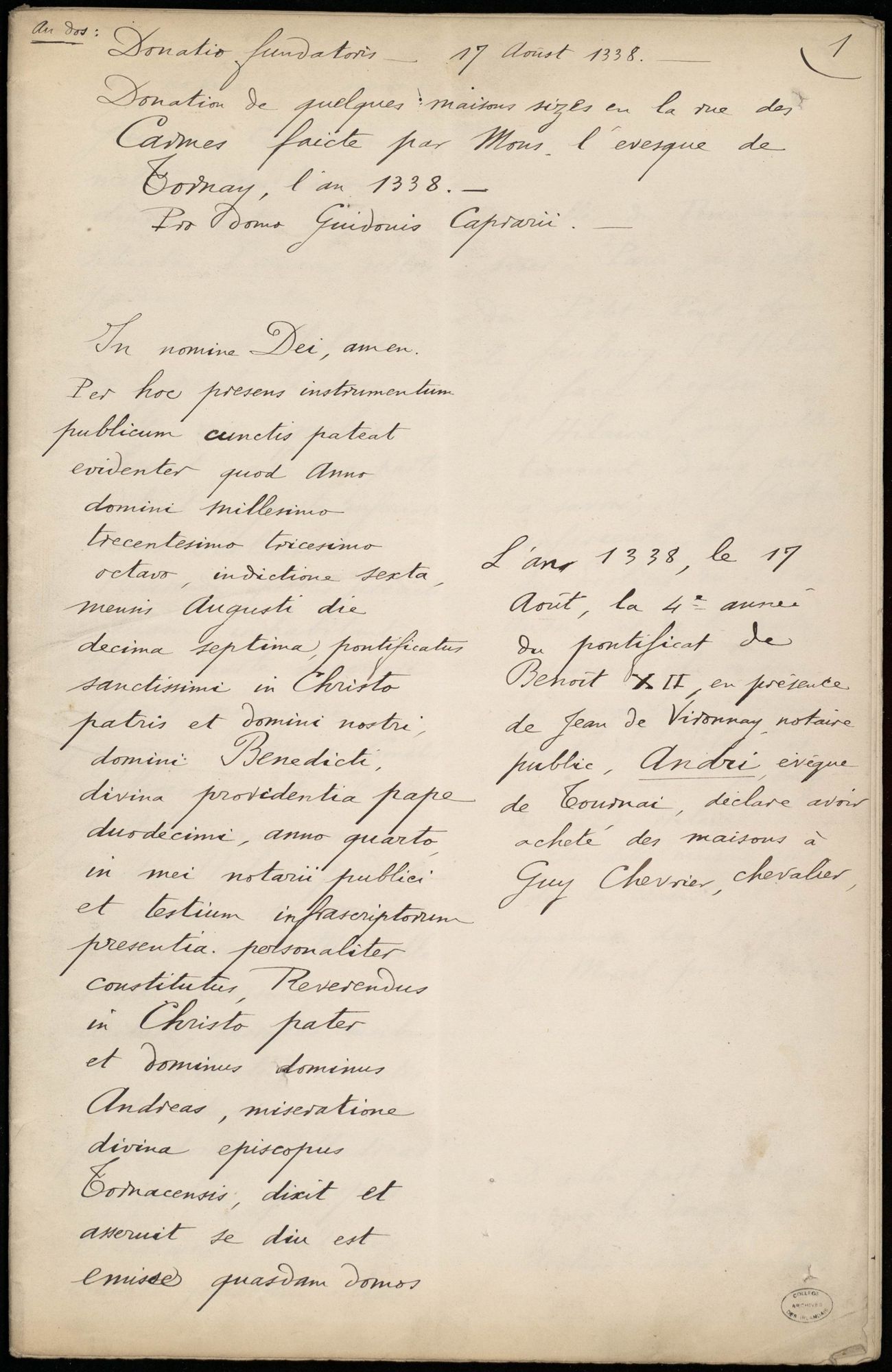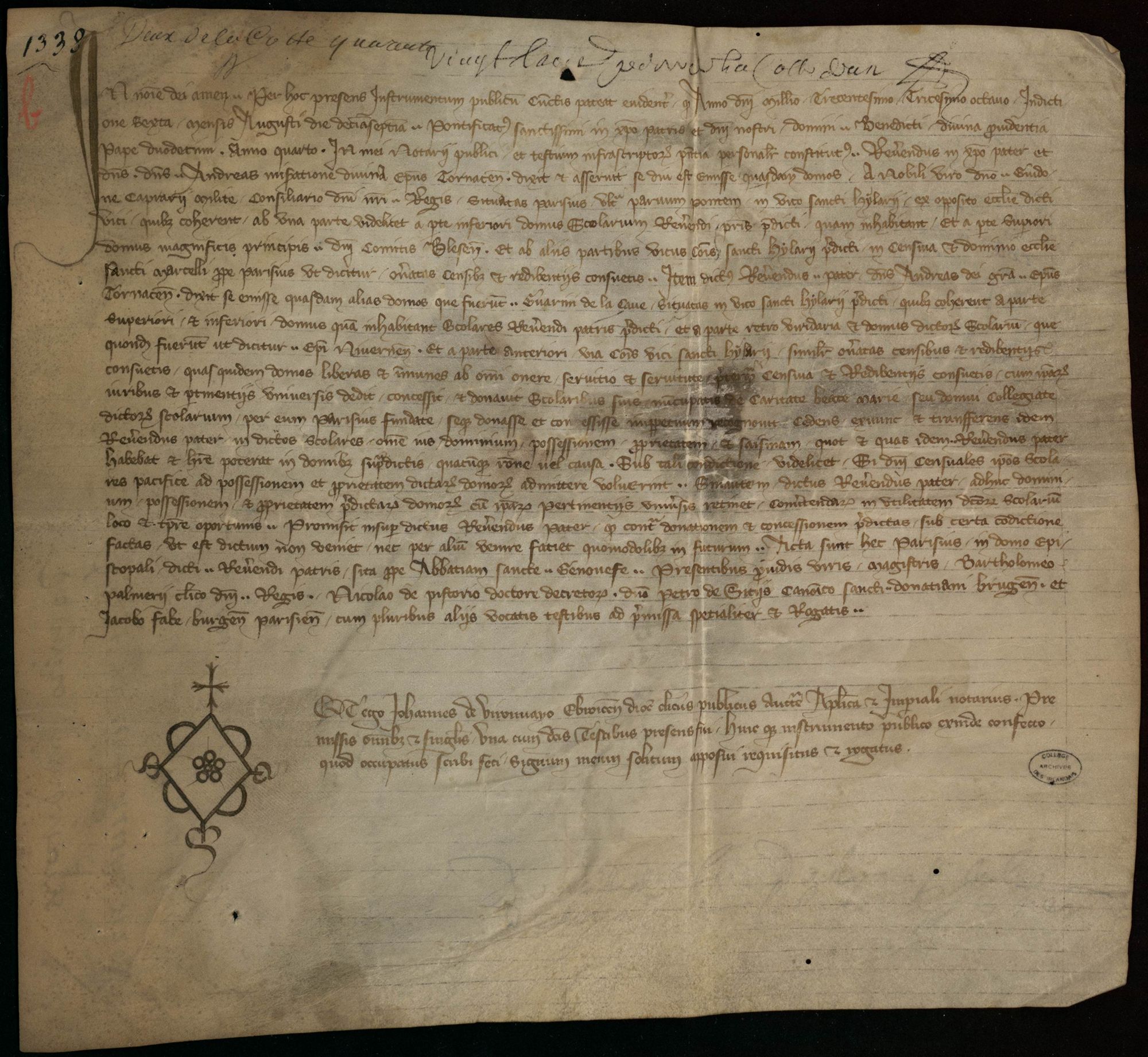 [Document original] Donation par André de Florence de maisons rue Saint-Hilaire aux écoliers lombards, 17 août 1338 (latin, parchemin), avec une transcription et une traduction sur papier, s.d.