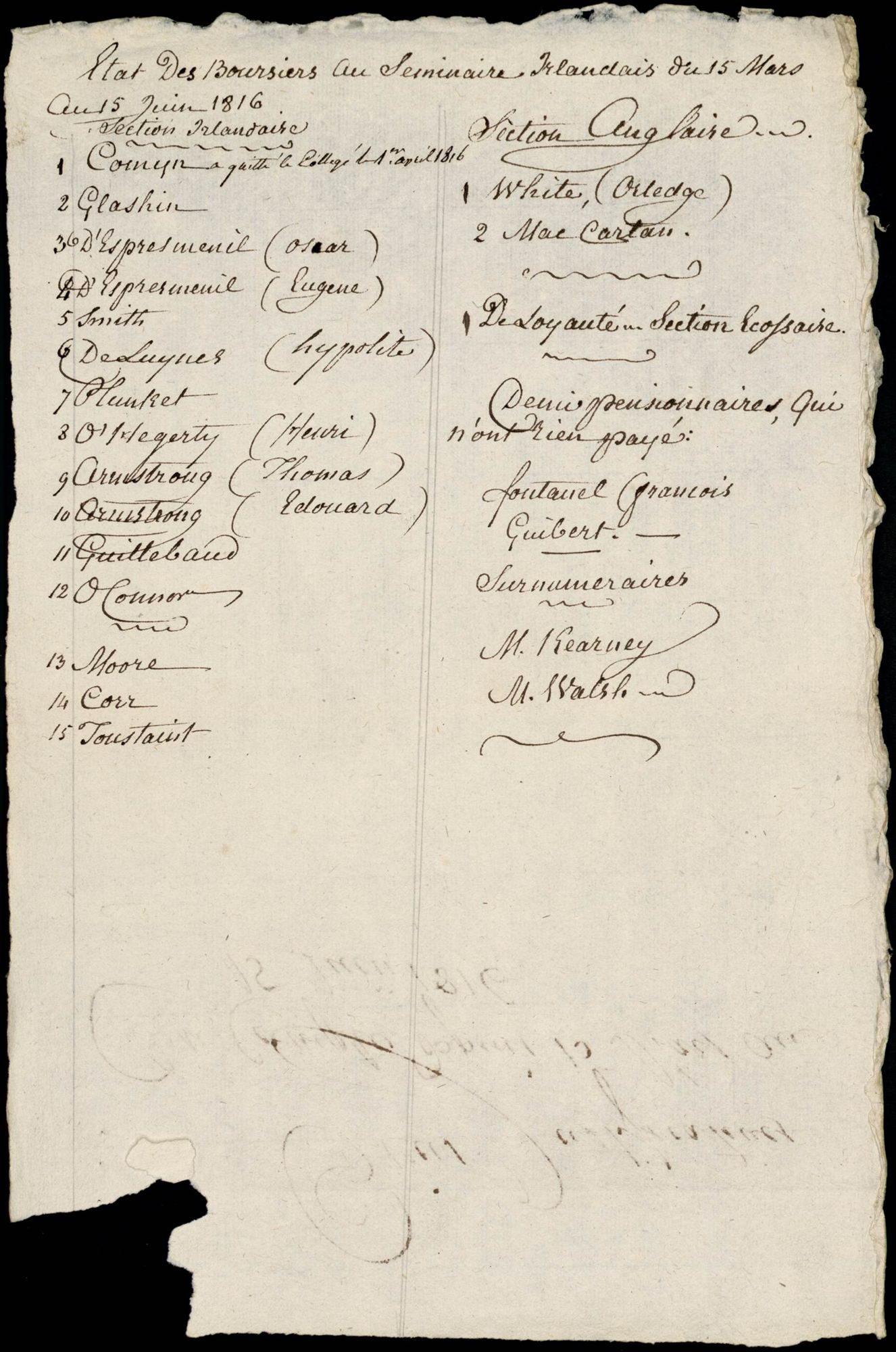 A2.e22, Etats des élèves boursiers à la charge du séminaire irlandais, 1816