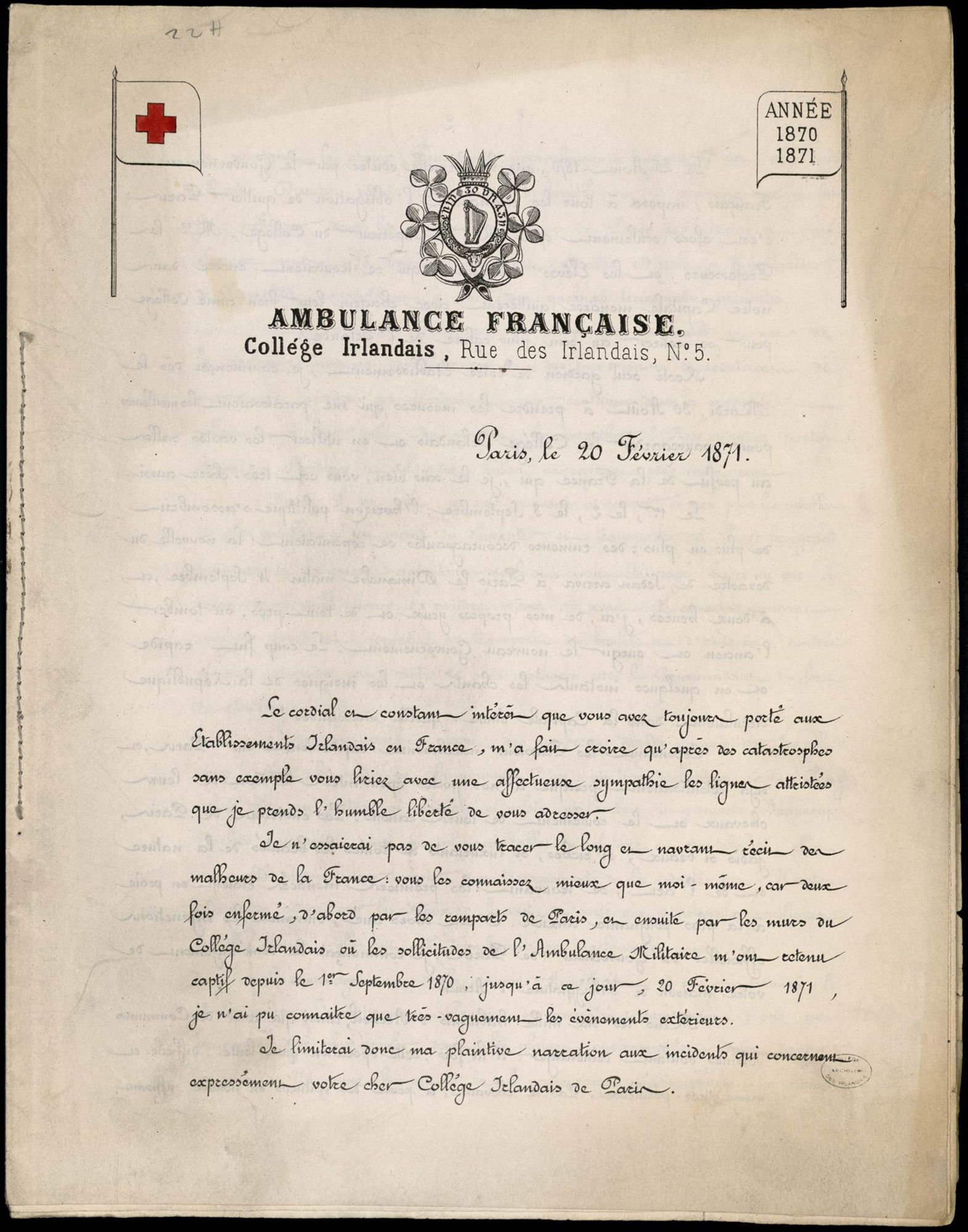 Deux exemplaires de la lettre de Charles Ouin-la-Croix (imprimés) et quatre lettres manuscrites de Charles Ouin-la-Croix (1871).
