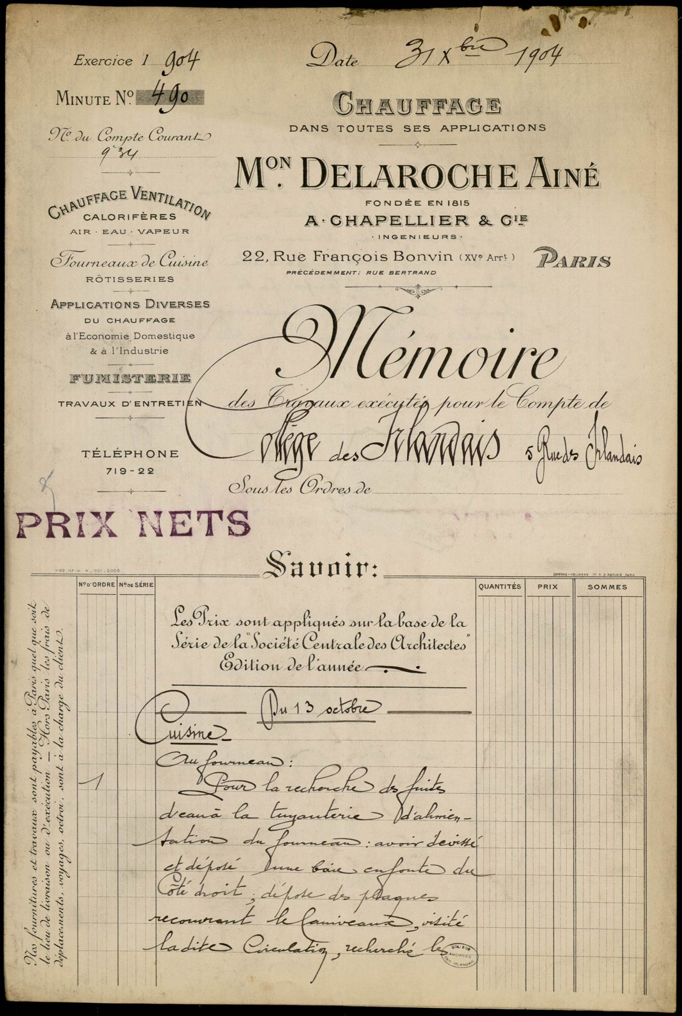 Mémoire de travaux de chauffage effectués au collège en 1904. A2.m37, Mémoire de travaux de chauffage, 1904 Cote A2.m37 Dossier Collège : travaux Dates 1904 Nombre de documents 1 Localisation M3T6 Permalien https://archives.centreculturelirlandais.com:443/ark:74216/1eab63330317618e97f50050569c4128.moteur=arko_default_5e7db8ae49cf6