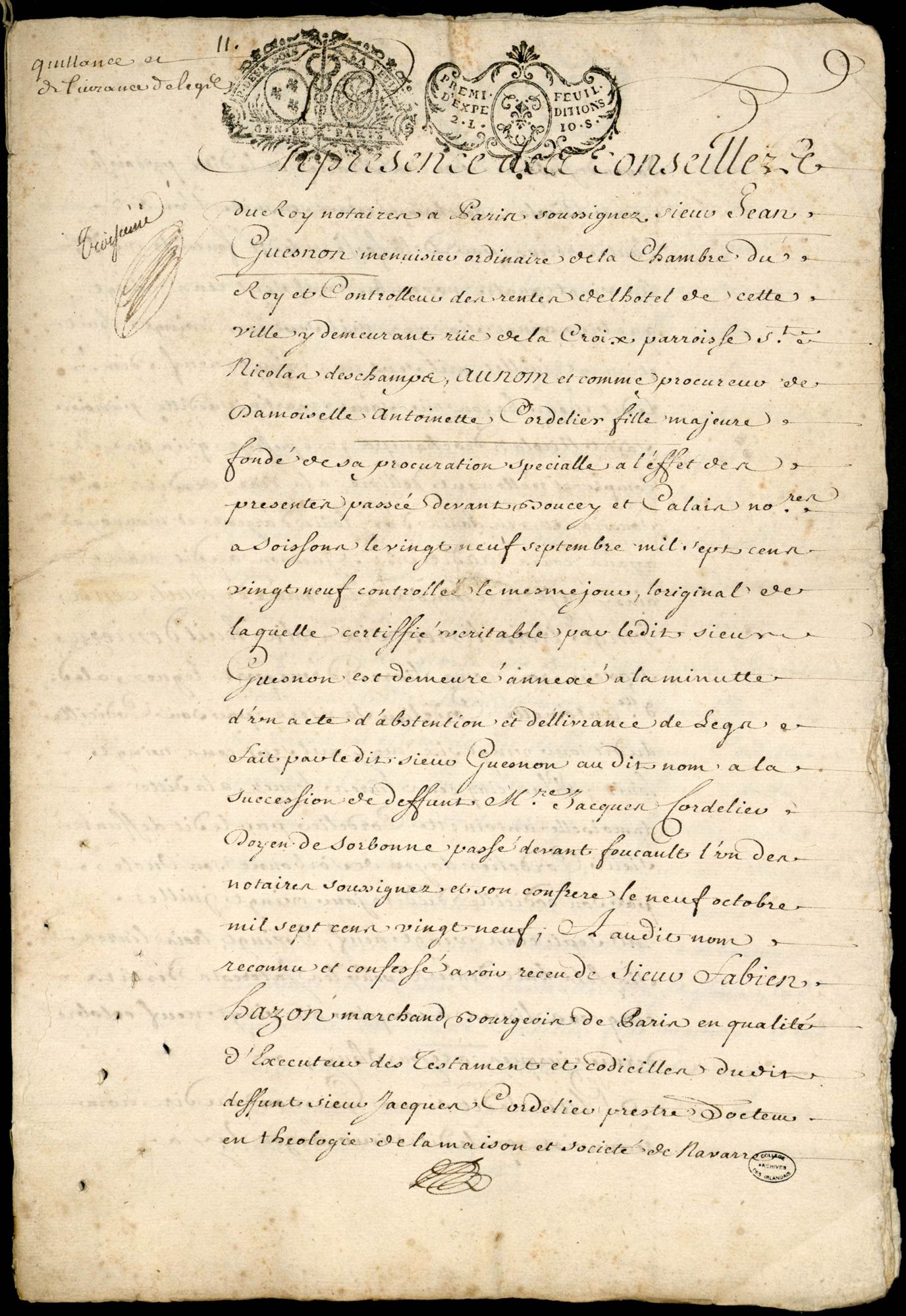 Quittance et délivrance de legs, 29 mai 1730.