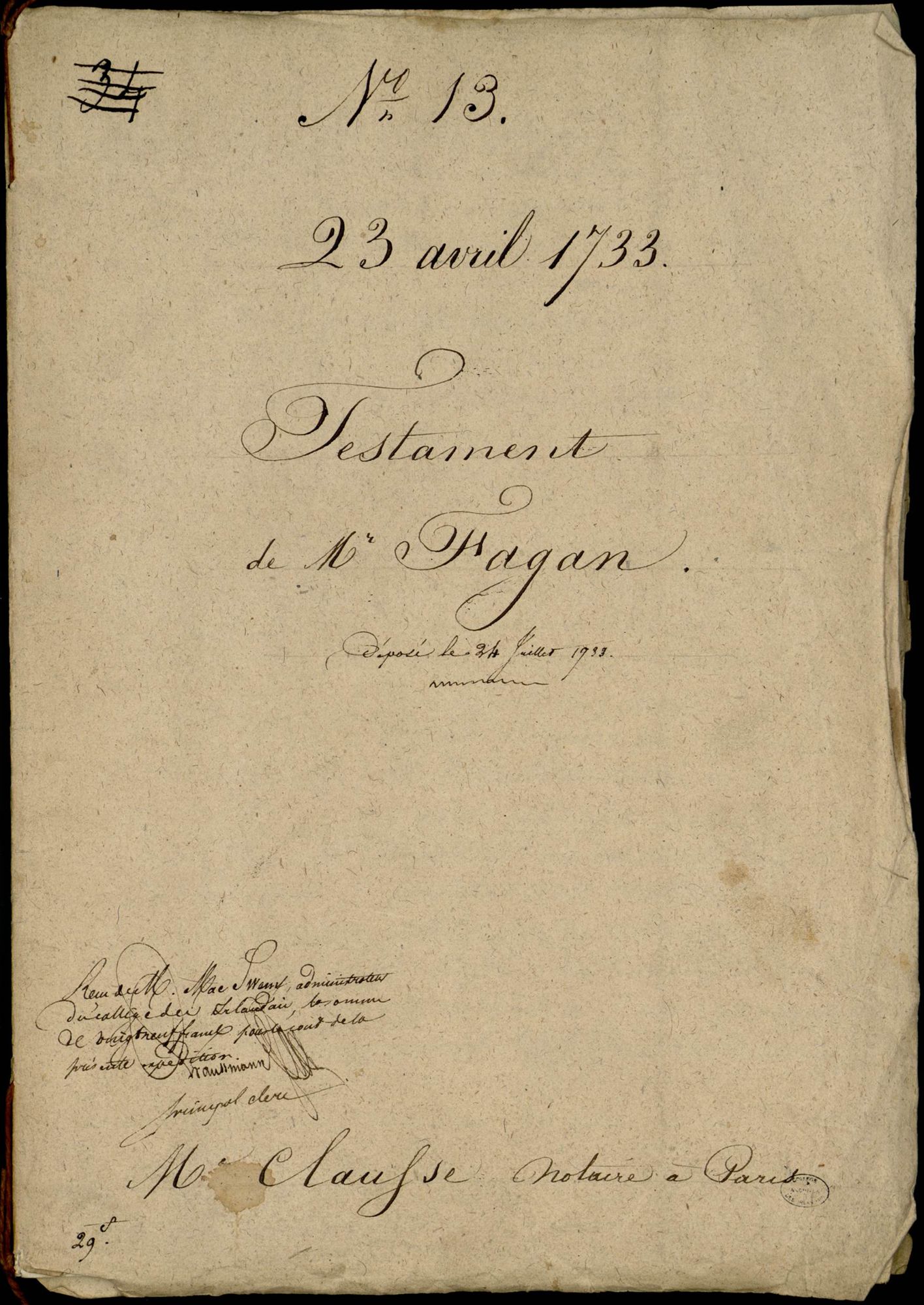 Copie du 18 décembre 1829 du testament de Luc Fagan du 24 juillet 1733.