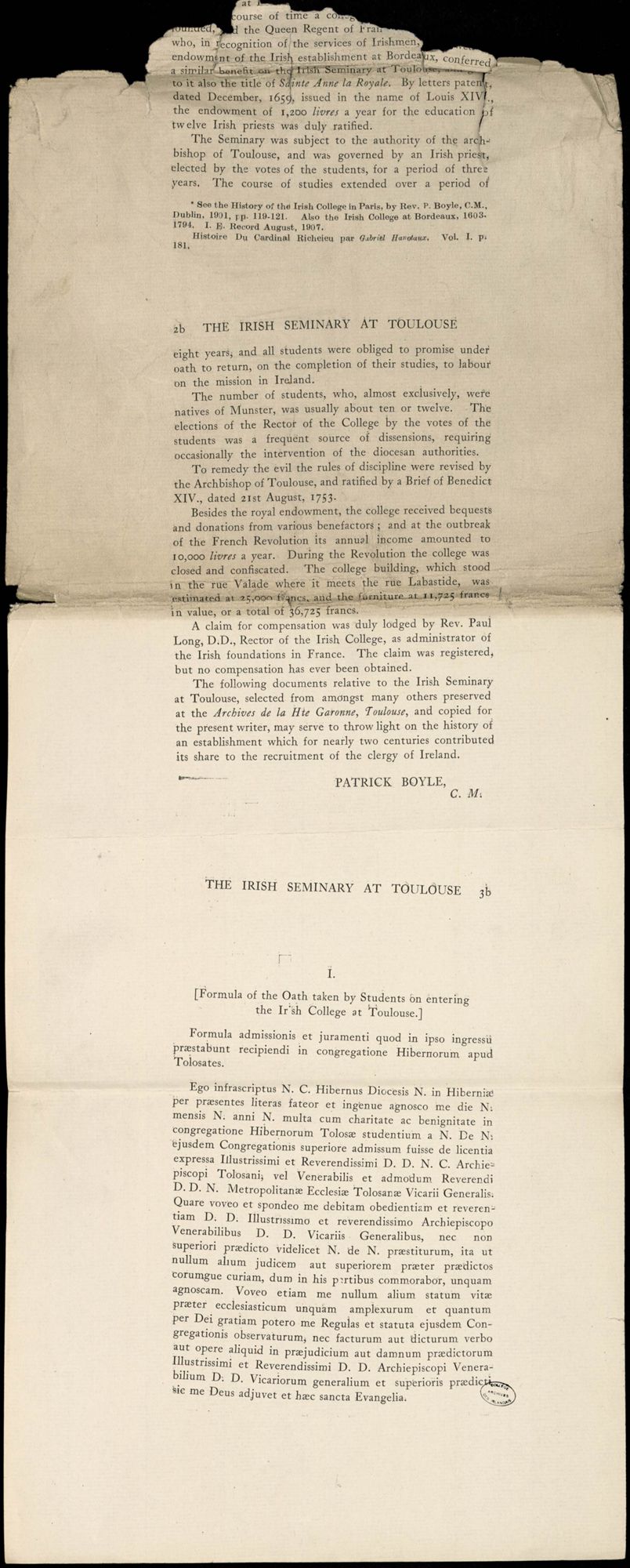 E8.a11, Pages imprimées sur le séminaire irlandais de Toulouse par Patrick Boyle