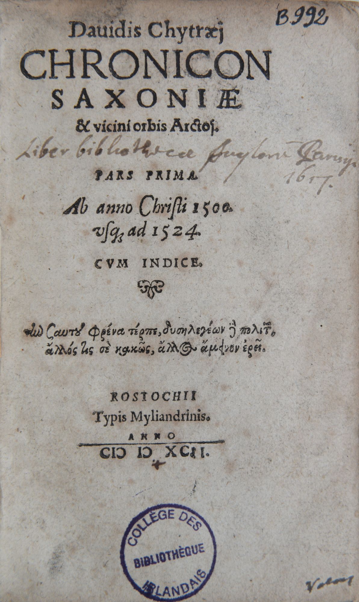 D. Chyträus, Chronicon Saxoniae, Rostock : Stephan Möllemann pour Lorenz Albrecht à Lübeck, 1590, 1590, USTC 628487 – B 992.