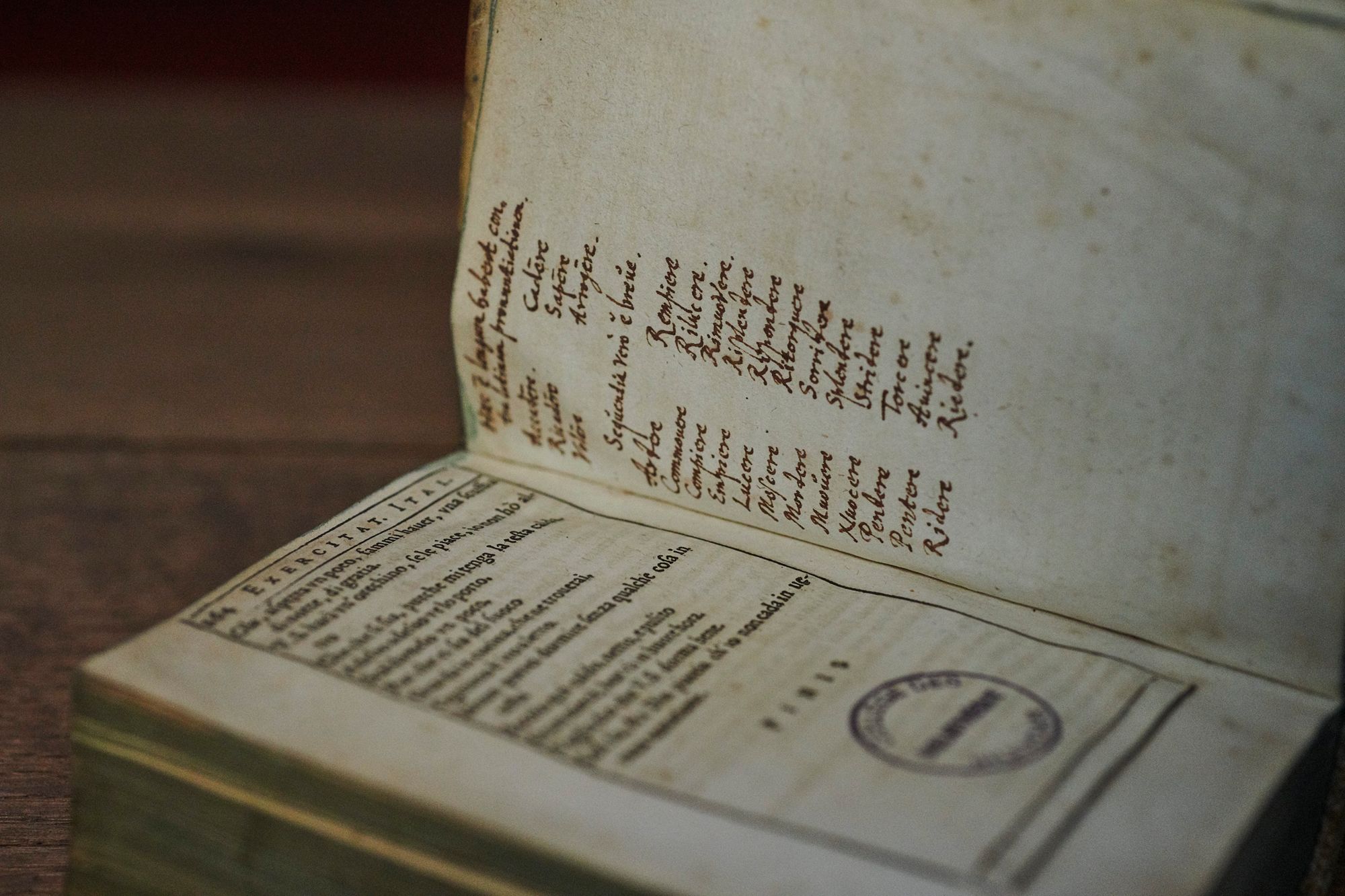 L’inscription latine, placée en haut de la page de droite de ce volume, illustre la diversité des façons d’acquérir un livre à la Renaissance. Un acquéreur n’était pas toujours obligé de passer par la boutique du libraire. La note manuscrite indique en effet que l’ouvrage fut acheté pour 50 sous en 1620 « in publica auctione librorum » (« pendant une vente publique aux enchères ») qui eut lieu après la mort de son premier possesseur.