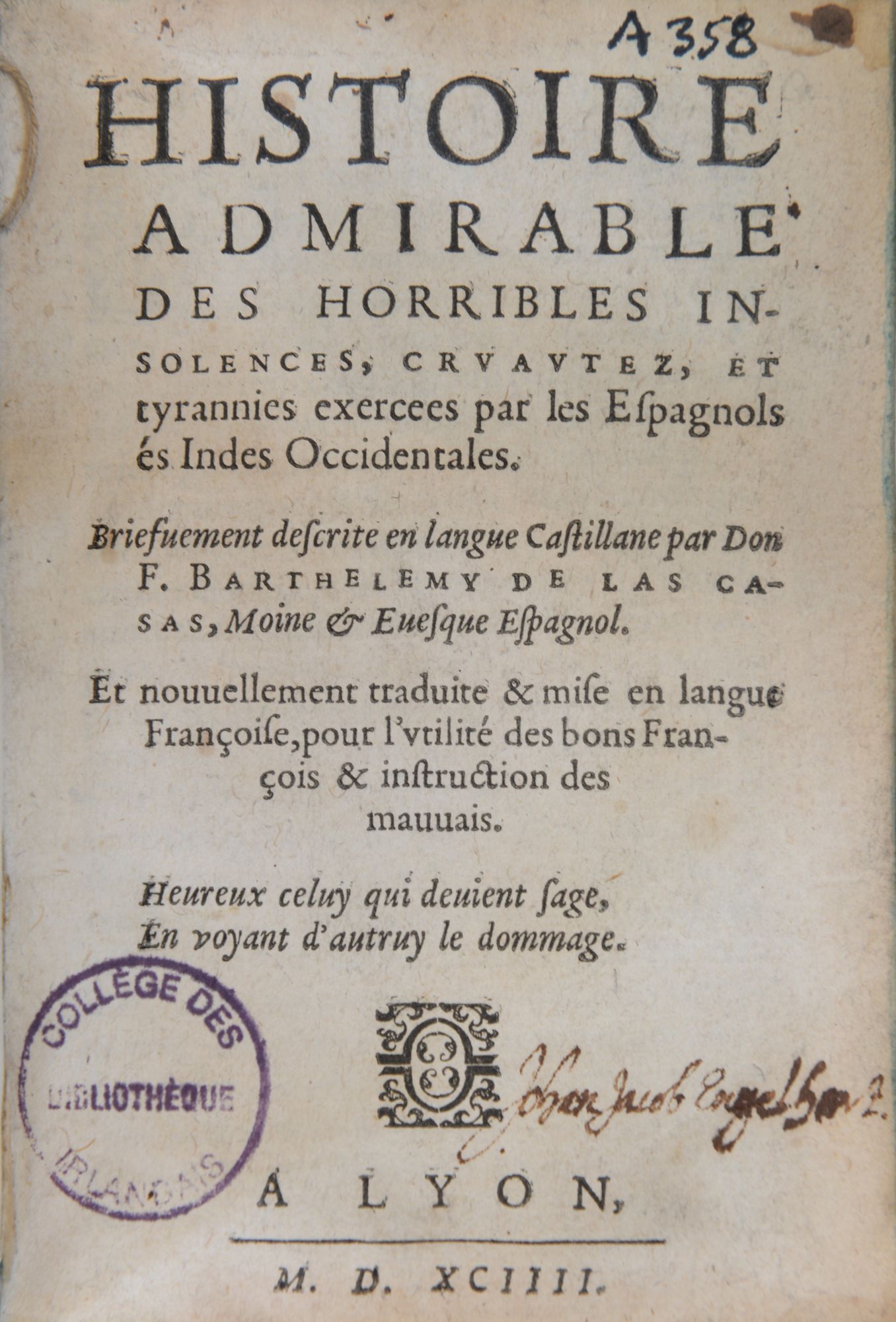 Bartolomé de las Casas, Histoire admirable des horribles insolences, cruautez, et tyrannies exercees par les Espagnols és Indes Occidentales, Lyon : s.n., 1594, USTC 37555 – A 358.