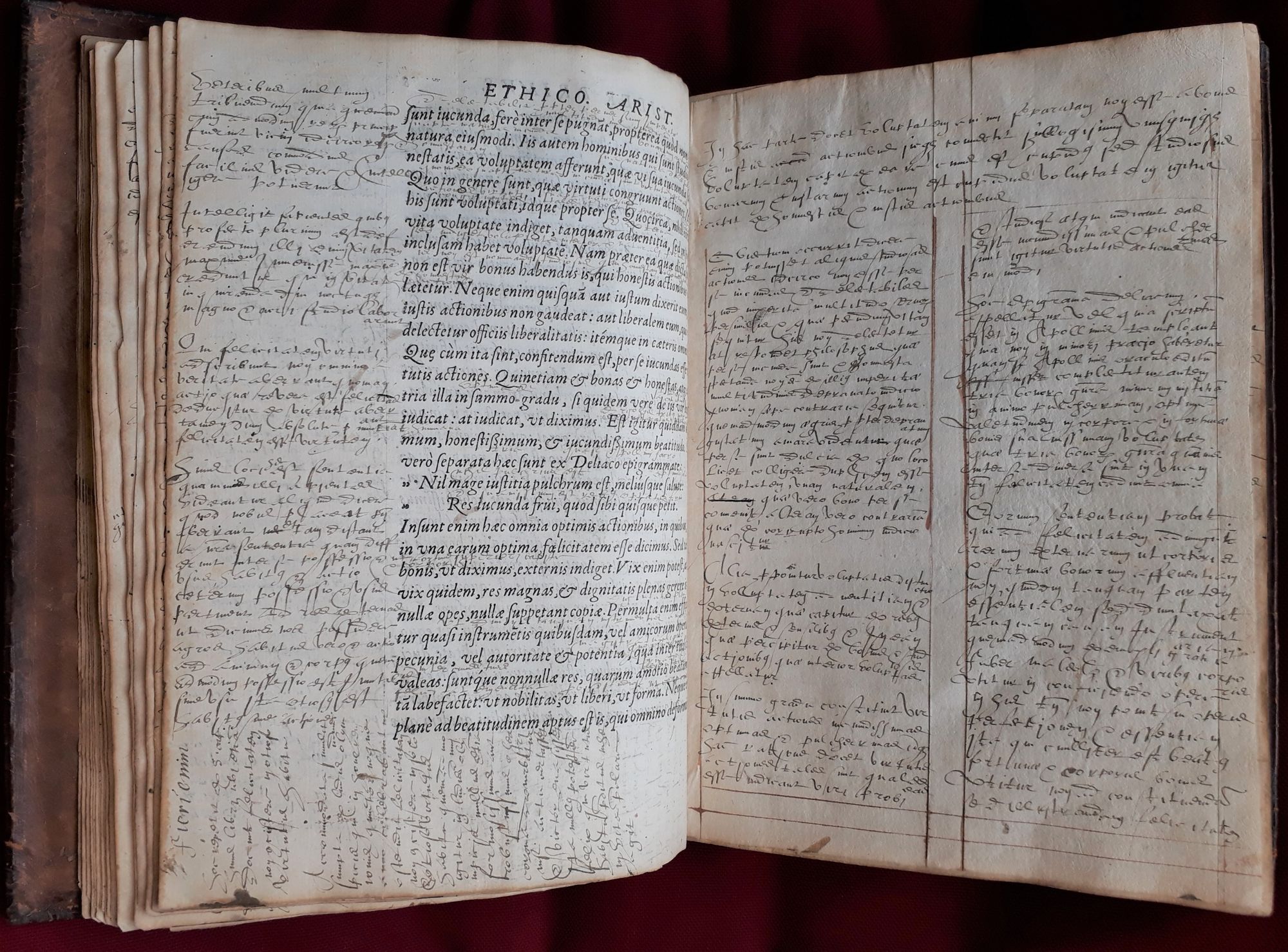 Dès son acquisition, sans doute dans un but scolaire, cet exemplaire d’une édition d’Aristote fut destiné à être annoté. On ajouta aux pages imprimées des feuillets vierges permettant au possesseur d’insérer de copieuses notes qui débordaient des marges, pourtant amples. Le volume devenait ainsi unique et précieux. Il nous offre un témoignage extraordinaire de la manière dont on étudiait ce texte classique à la Renaissance.