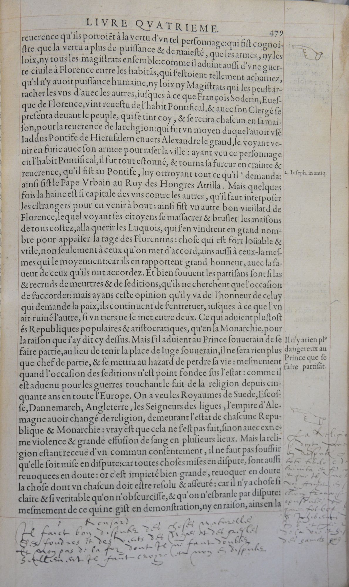 Les annotations constituent souvent des indices sur la façon dont on lisait les textes et révèlent même parfois des détails sur le contexte de lecture. Ici, nous voyons une association surprenante entre le livre de Bodin et des vers de Ronsard, recopiés au bas de la page : « Il faict bon disputer des choses naturelles / Des foudres et des vents, des neges et des gresles / Et non pas de la foy dont il ne faut doubter / Seullement il faut croyre et non en disputer ».