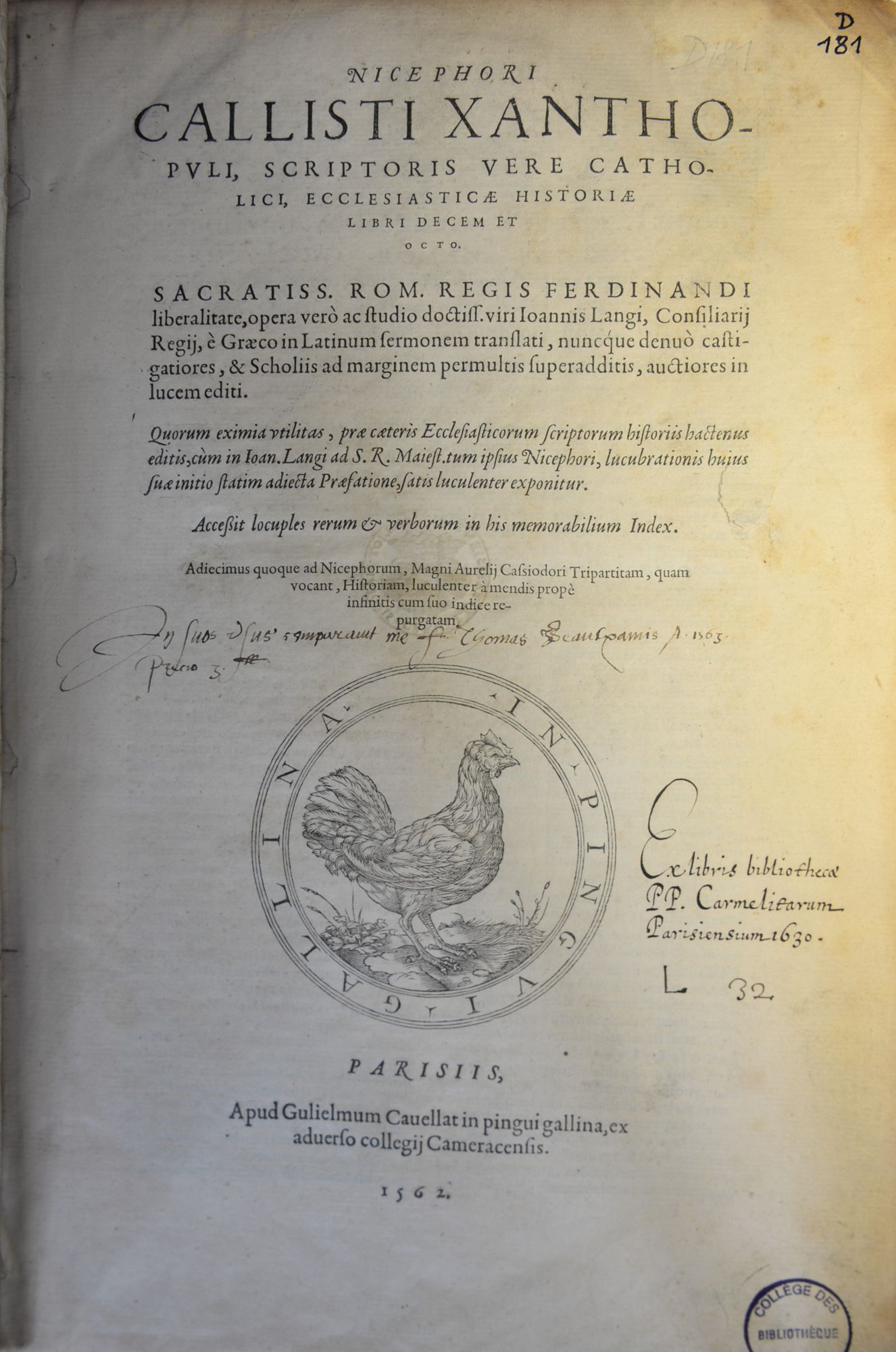 Cette cohérence de thème et de provenance est cependant limitée et l’on trouve des exemplaires d’origines diverses. Ces exemplaires ont parfois appartenu à la bibliothèque de contemporains célèbres, souvent eux-mêmes auteurs. On peut notamment citer cette édition latine de l’Histoire ecclésiastique ayant appartenu à Thomas Beauxamis, l’un des polémistes et théologiens les plus prolifiques du XVIe siècle.