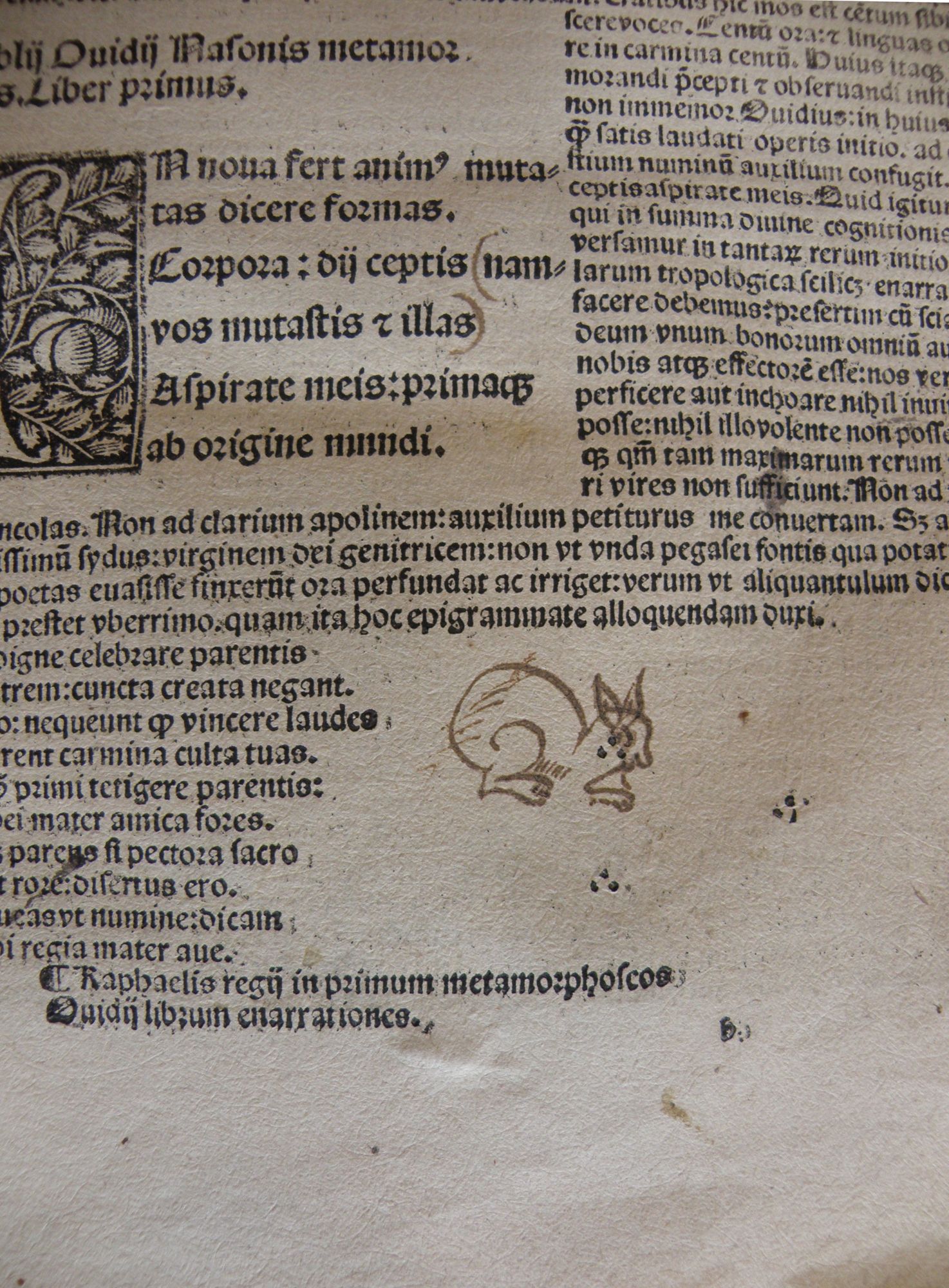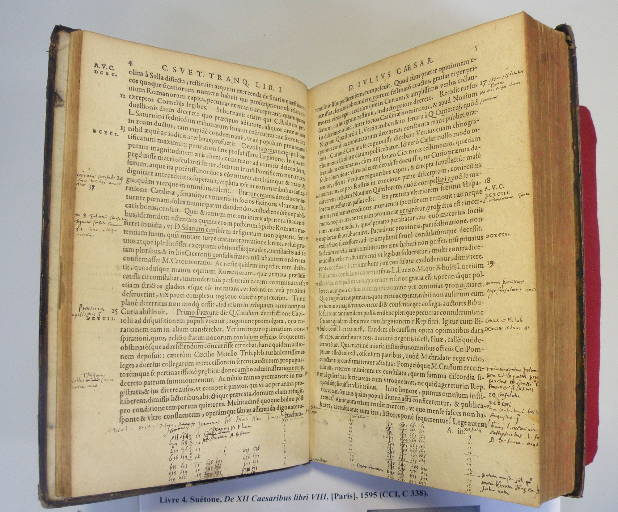 La correction et le commentaire des textes classiques est une pratique courante des lettrés de la Renaissance. Cette Vie des douze Césars de Suétone a servi de support au travail d'un certain Simon, qui signe quelques marginalia, comme au milieu de la page 5.