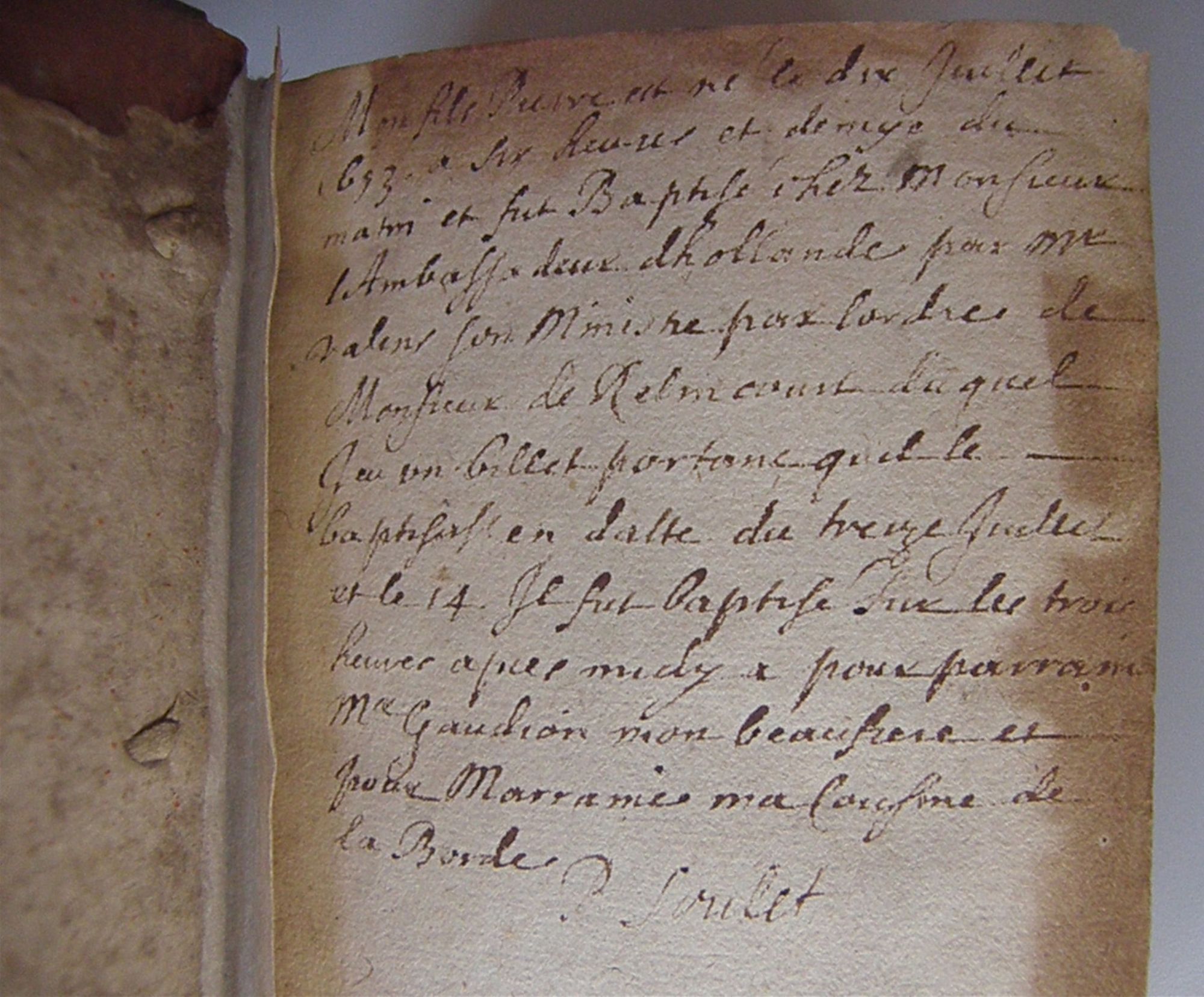 « Mon fils Pierre est né le dix juillet 1693 a six heures et demye du matin et fut baptisé chez Monsieur l'Ambassadeur d'Hollande par Mr Valens son ministre par l'ordre de Monsieur de Relmcourt duquel j'ai un billet portant qu'il le baptisast en datte du treize juillet et le 14 il fut baptisé sur les trois heures apres mydi a pour parrain Mr Gaudion mon beau frere et pour marraine ma cousine de la Borde