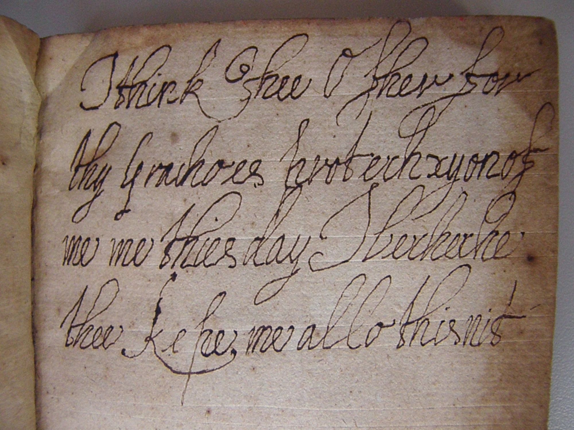 Ce petit ouvrage consacré aux récents événements d'Angleterre a appartenu à une certaine Breget Sdke, qui signe maladroitement son nom sur la première page de garde. Ici, elle a pris soin de tracer des lignes pour guider sa plume dans l'écriture de cette humble prière qui fait écho aux propos du livre.