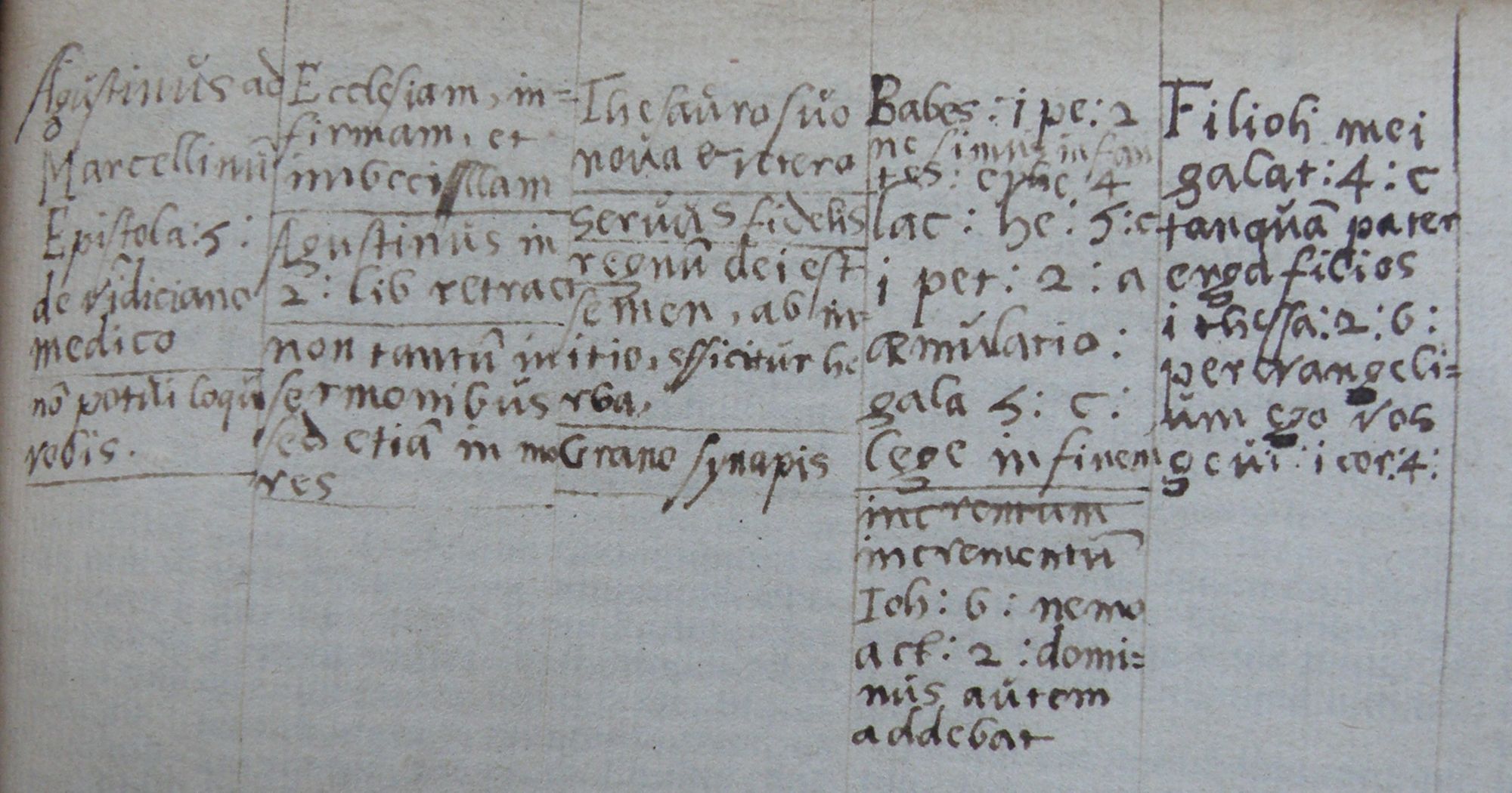 Sur un feuillet inséré dans un Nouveau Testament de 1538, le lecteur rassemble cinq colonnes de citations bibliques renvoyant à la figure de l'enfant, du lait, de la semence ou de l'élection. Ce tableau illustre la pratique savante des recueils de « lieux communs ». Il matérialise également un principe essentiel des études bibliques, celui de, l'autoexplication des écritures saintes, les textes s'éclairant mutuellement par des renvois en cascade.