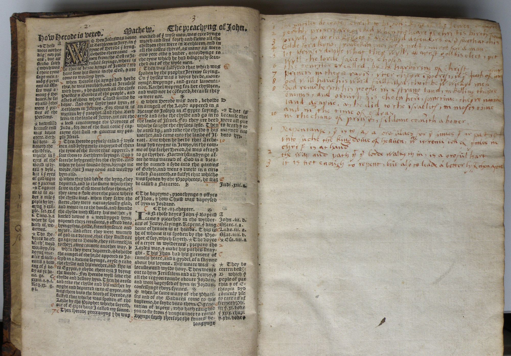Ici, le lecteur commente minutieusement le texte de l'évangile selon saint Matthieu. Certaines annotations confinent à la paraphrase (1, 2), quand d'autres éclaircissent la symbolique biblique (4). On y trouve des réflexions religieuses (5) et politiques (6), ainsi que des références aux événements contemporains (3). Dans la même Bible de 1538, le lecteur a reporté le numéro des chapitres en tête de colonne pour pouvoir circuler plus aisément dans l'ouvrage. Il relève les formes de discours présentes dans l'évangile de Matthieu en utilisant un système de symboles dont il place le « mode d'emploi » en tête de l'ouvrage. Les marques semi-circulaires (C) renvoient aux mots propres de l'évangéliste, les marques circulaires (O) aux paroles qu'il rapporte. Les premiers mots des interventions verbales sont soulignés, ce qui renforce visuellement l'alternance des modes de discours. Des numéros glissés dans la marge renvoient aux commentaires portés en regard du texte.