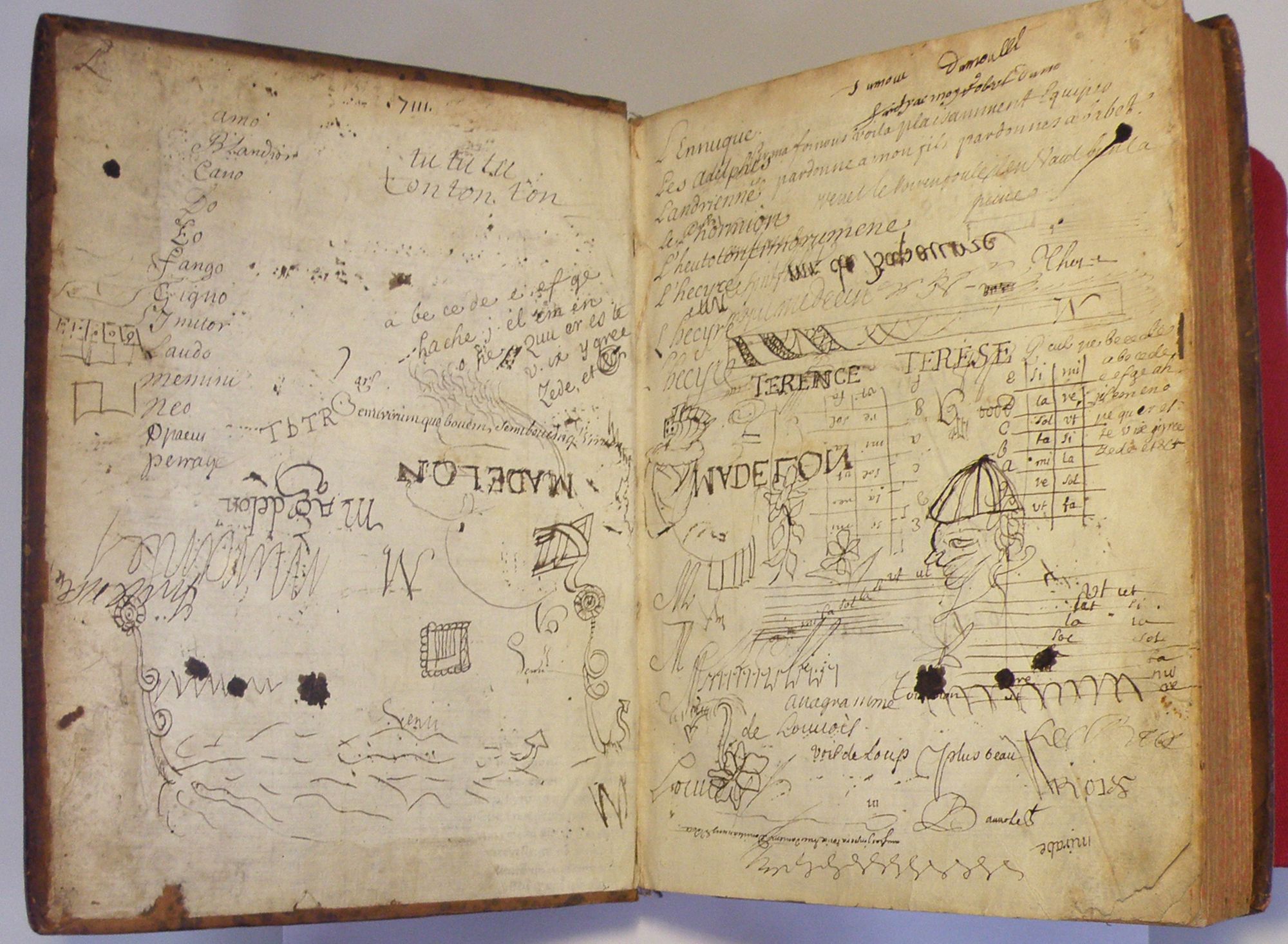 La familiarité des jeunes lecteurs avec l'objet-livre se manifeste dès les premières pages des volumes. Elles accueillent les plumes dissipées, mais forment également un espace de sociabilité juvénile et d'affirmation personnelle. Sur cet exemplaire des Institutions de Théophilus Antecessor, des élèves ont couvert les pages de garde de dessins, signatures, jeux de mots ou messages codés qui reflètent une culture profondément nourrie par les références classiques.