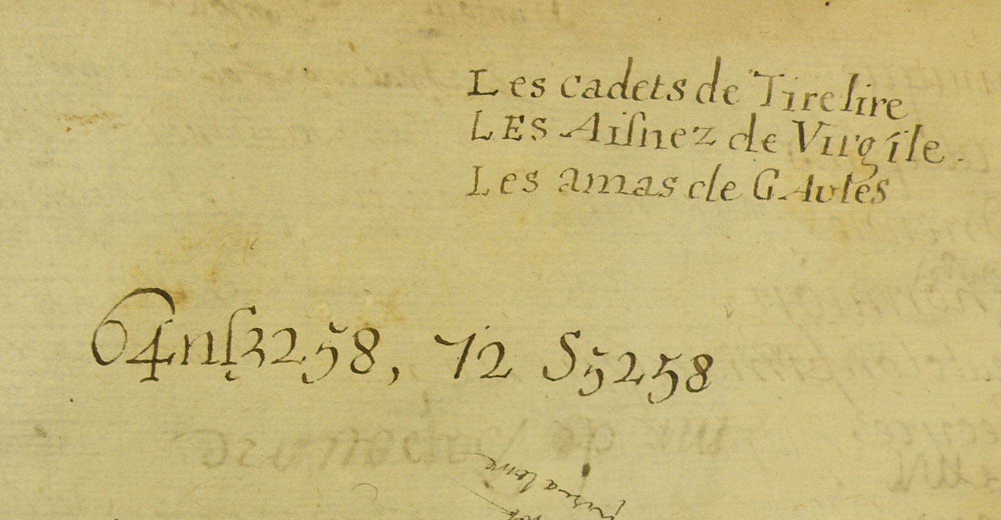 Les élèves ont déguisé des titres célèbres : sous « les cadets de Tirelire », se cachent les Décades de Tite-Live et, de la même manière, l'Enéide de Virgile et l'Amadis de Gaule. La clé du message codé se trouve sur une autre page du volume. Elle permet de lire, sous les chiffres, « Monsieur Le Sueur ».