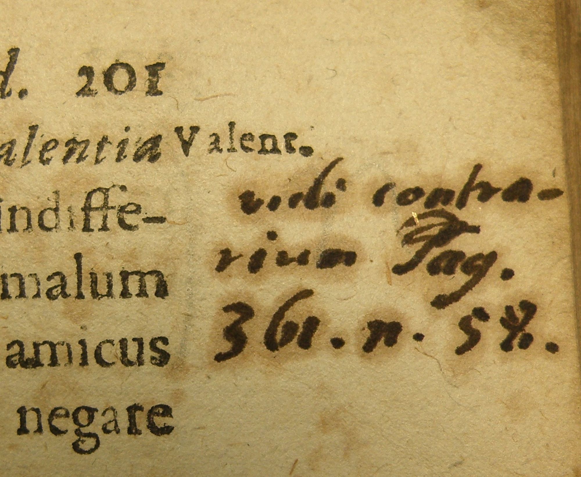 Sur le même livre, d'autres ont relevé les contradictions du jésuite sous la forme de renvois marginaux imitant les marginalia imprimés. Quand l'auteur, à la question « Est-ce pécher que de louer sa maison à un couple adultère ? », répond « non » à un endroit, « oui » un peu plus loin, les lecteurs épinglent la dissonance dans la marge. La note : « vedi contrarium Pag. 361 n.58 » (« voir le contraire pag. 361, n° 58 ») a son pendant page 361.