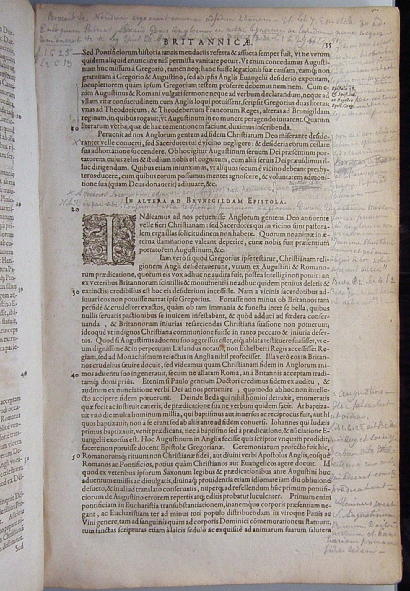 Dans la seconde moitié du XVIe siècle, la réforme religieuse d'Elisabeth Ière et sa rupture avec Rome se sont appuyées sur une réécriture de l'histoire. L'auteur de cette histoire de l'Eglise britannique minimise l'importance de la mission d'évangélisation de saint Augustin, envoyé de Rome, et préfère décrire une conversion « indigène ». Le lecteur s'offusque de ce traitement. L'énergie de la ponctuation et la précision des citations montrent l'intensité du débat historiographique, près de deux siècles après la parution de l'ouvrage.