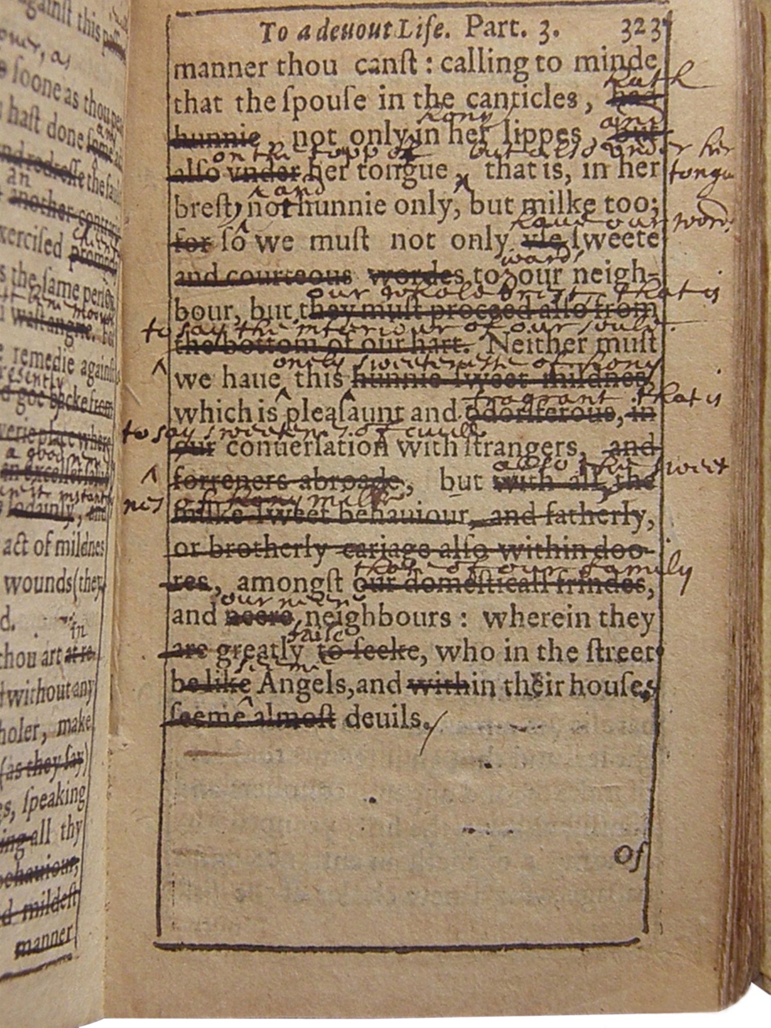 Certains exemplaires annotés sont enfin spécifiquement utilisés pour la production d'un nouveau livre, comme les éditions classiques des humanistes ou les volumes corrigés par leurs auteurs en vue d'une nouvelle édition. Cet exemplaire de l'Introduction à la vie dévote de François de Sales a servi de support de travail à la nouvelle traduction publiée à Paris en 1648 par des « prêtres anglais du collège de Tournai ». L'ouvrage illustre le rôle joué par les catholiques anglais en exil en France dans la diffusion de nombreux textes de dévotion. Par ce biais, l'œuvre de François de Sales a exercé une influence considérable sur la littérature religieuse anglaise de la première moitié du XVIIe siècle, bien au-delà des seuls milieux catholiques.