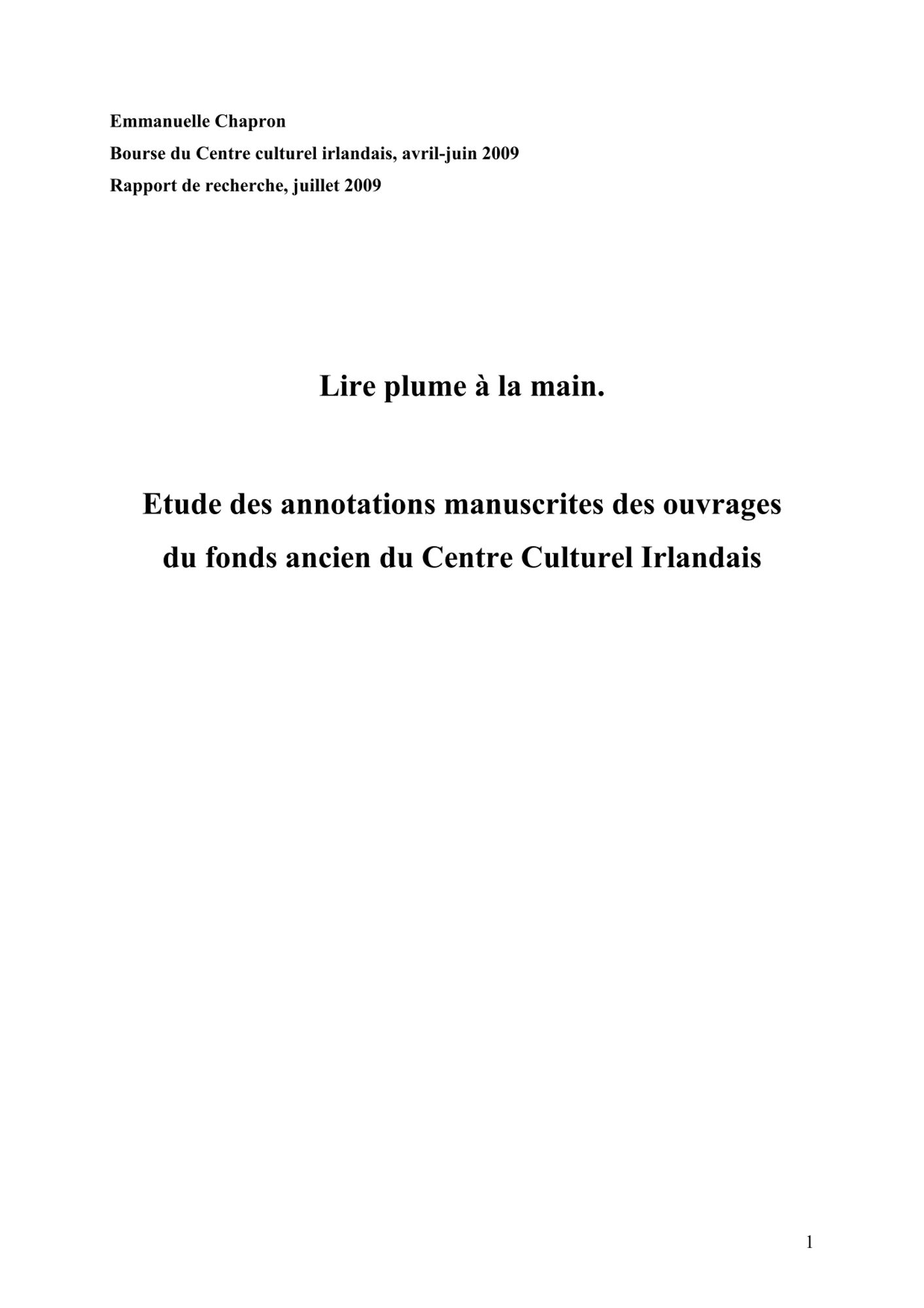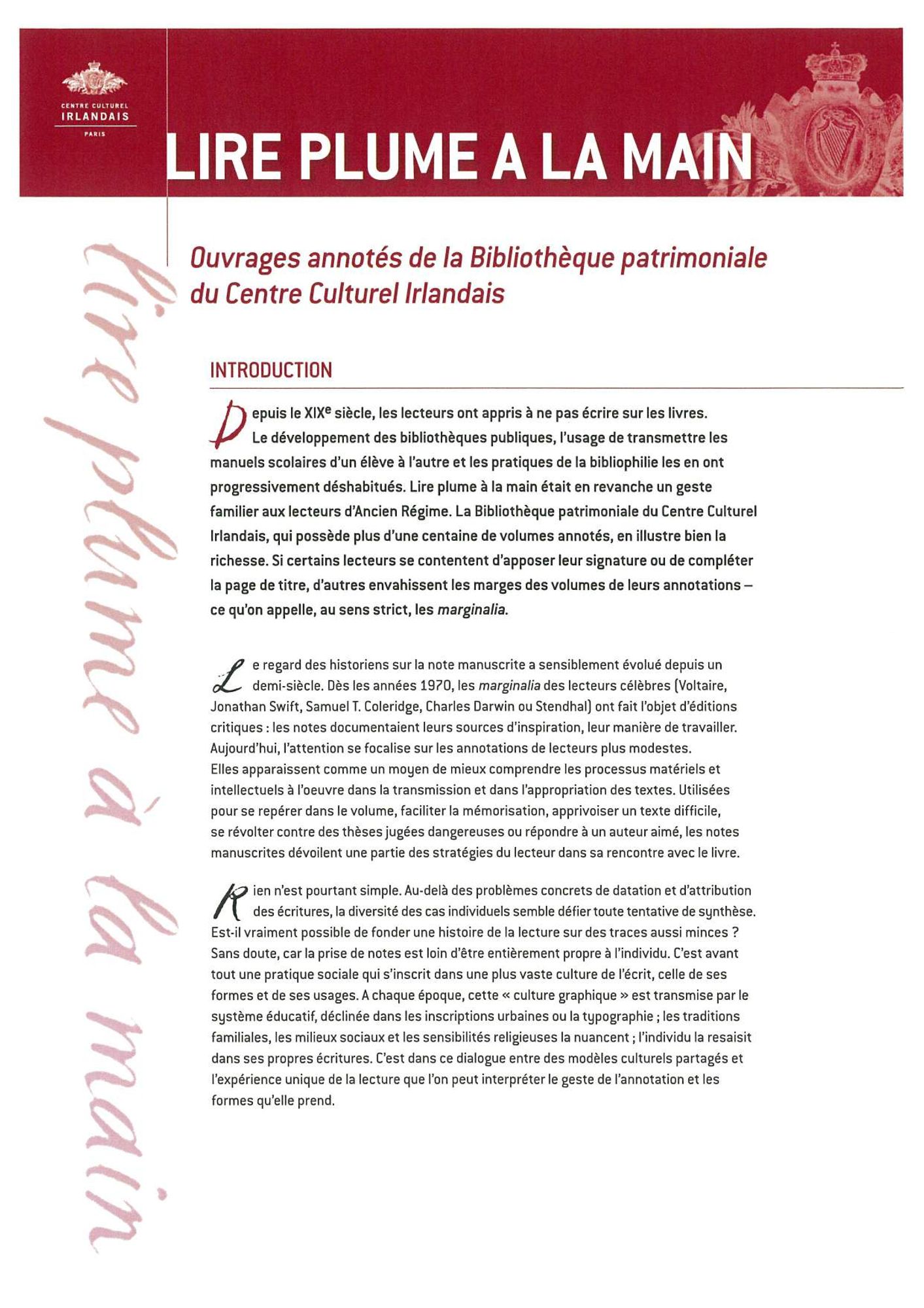 Depuis le XIXe siècle, les lecteurs ont appris à ne pas écrire sur les livres. Le développement des bibliothèques publiques, l'usage de transmettre les manuels scolaires d'un élève à l'autre et les pratiques de la bibliophilie les en ont progressivement déshabitués. Lire plume à la main était en revanche un geste familier aux lecteurs d'Ancien Régime. La bibliothèque patrimoniale du Centre Culturel Irlandais, qui possède plus d'une centaine de volumes annotés, en illustre bien la richesse. Ces livres couvrent toute la période du XVe au XVIIIe siècle, avec une surreprésentation du XVIIe siècle. Ils illustrent les pratiques d'une élite intellectuelle frottée aux traités de théologie, de controverse religieuse, de droit et d'histoire. Si certains lecteurs se contentent d'apposer leur signature ou de compléter la page de titre, d'autres envahissent les marges des volumes de leurs annotations - ce qu'on appelle, au sens strict, les marginalia.