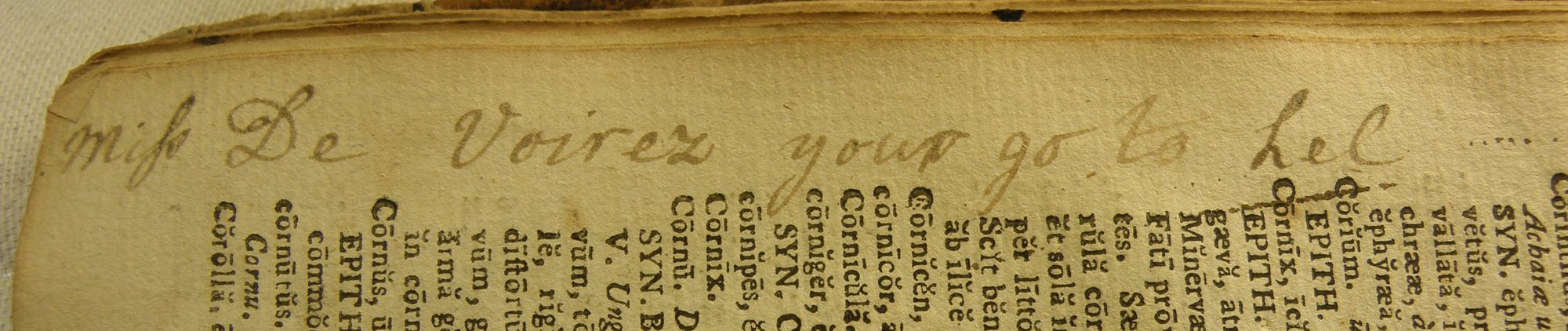 De très nombreux amis des adolescents ont apposé leur signature sur les marges du Gradus. Le volume porte la marque des amitiés et des rivalités, des attirances et des tensions. Ici, « Miss De Voirez allez en enfer » !