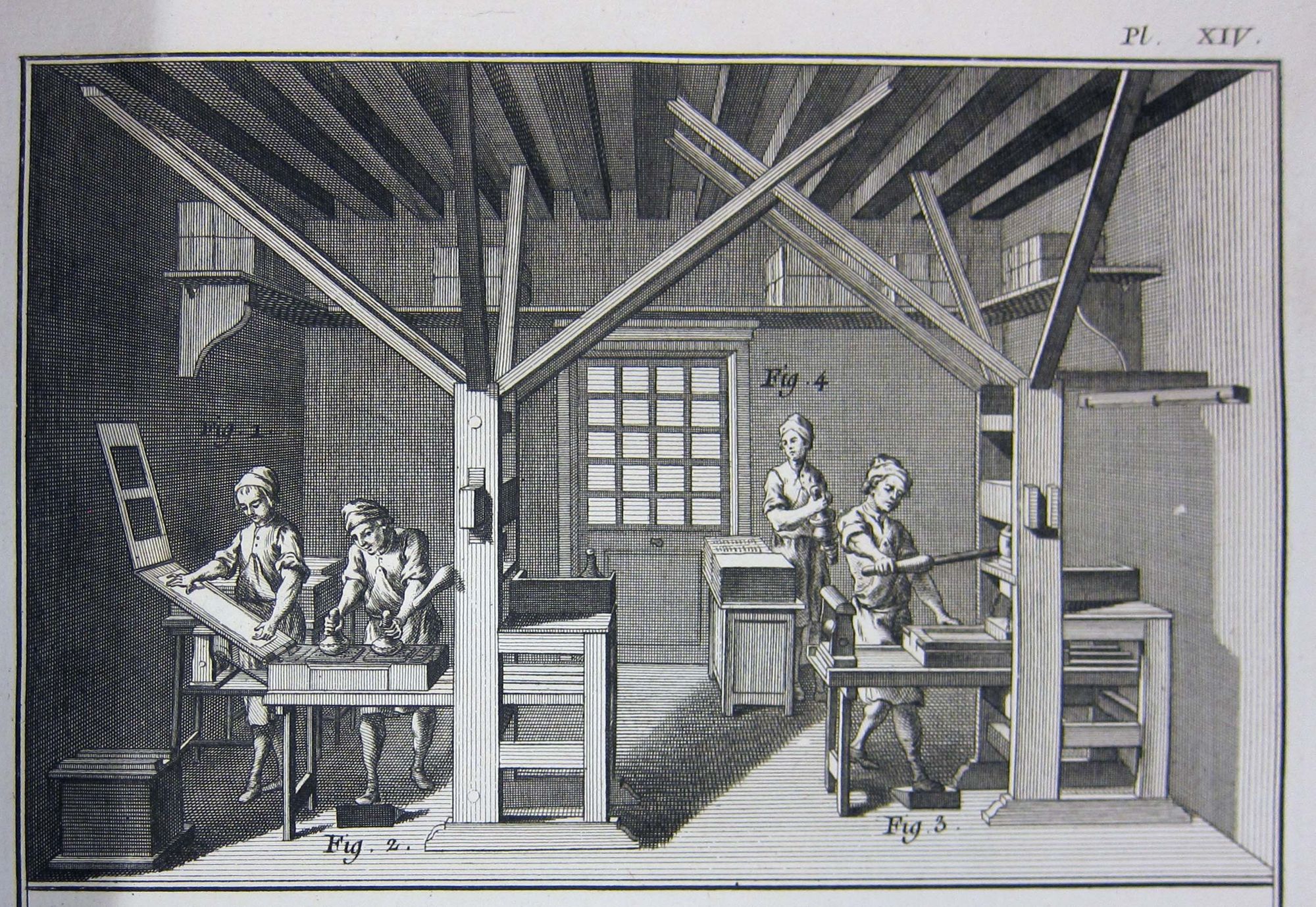 Dans l’Encyclopédie ou Dictionnaire raisonné des sciences, des arts et des métiers de Diderot et D’Alembert (1751-1772), l’article sur l’imprimerie est illustré d’une gravure très détaillée présentant l’intérieur d’un atelier de presse (planche XIV du volume VI des planches)