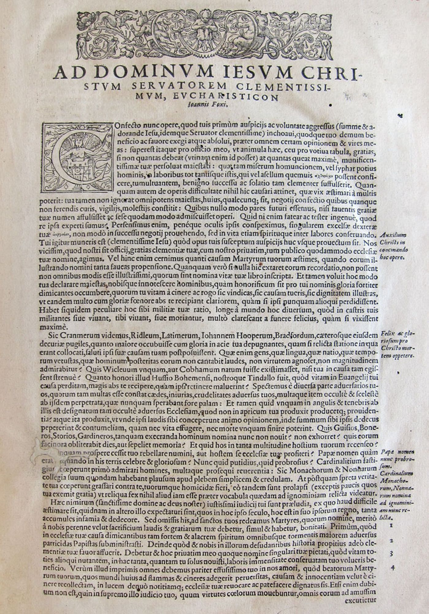 1563 marque la publication de la première édition des Actes and monuments of these latter and perilous days touching matters of the Church. Se basant sur des sources orales et des archives, cet ouvrage (orné d'illustrations dans ses éditions les plus tardives) rapporte les histoires terribles et funestes des personnes exécutées sous le règne de Marie Ire, ce qui lui valut d'être communément appelé : « Le Livre des Martyrs de Foxe ».