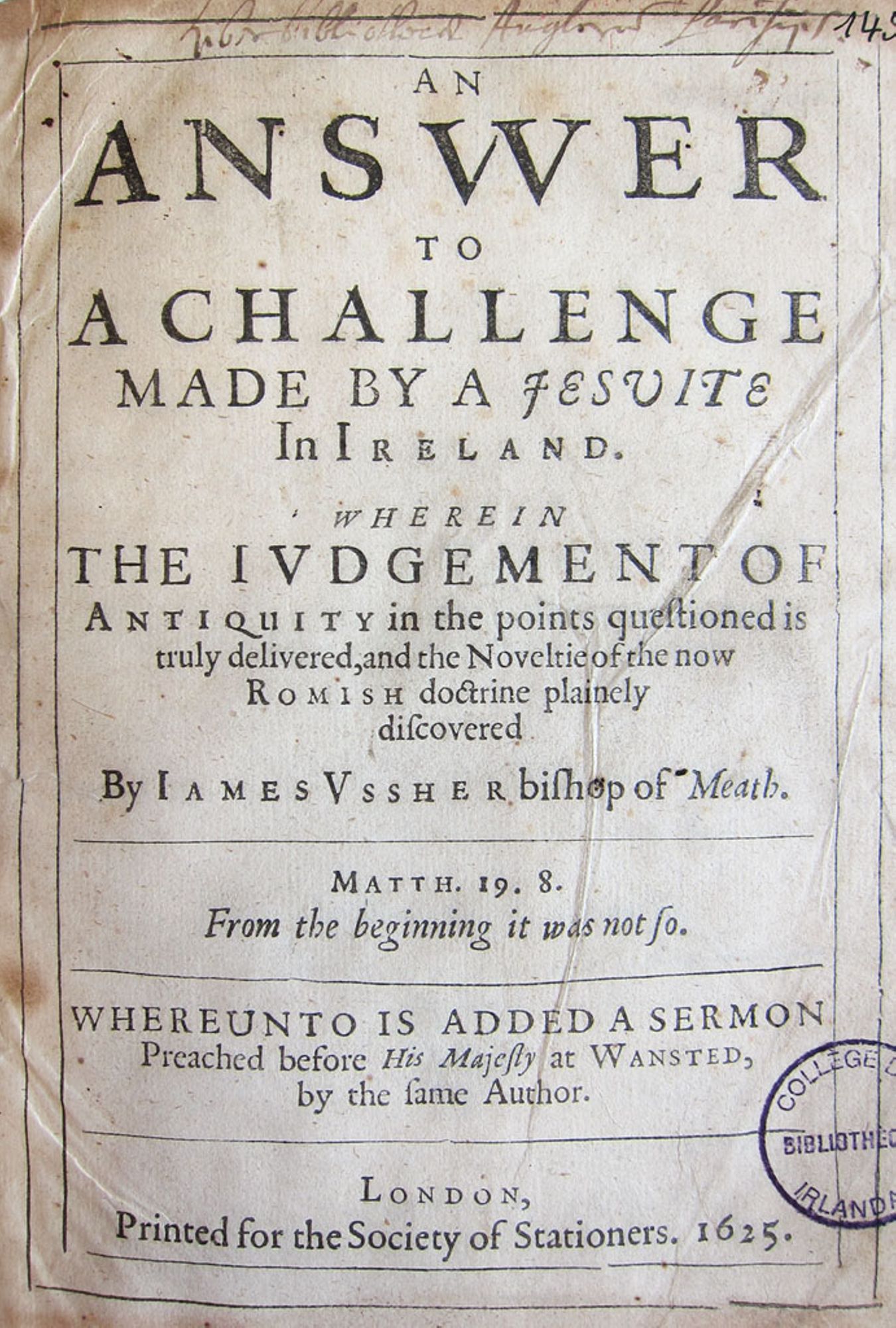 En 1619, Ussher fut reçu par le Roi Jacques Ier (d'Angleterre, d'Irlande et d'Écosse) et fit forte impression. Rapidement promu, il fut l'une des principales personnalités à défendre le protestantisme comme la forme juste du christianisme. L'œuvre d'Ussher, An answer to a challenge made by a Jesuite in Ireland, brillamment argumentée et rédigée, répondait aux précédents travaux du jésuite irlandais William Malone.