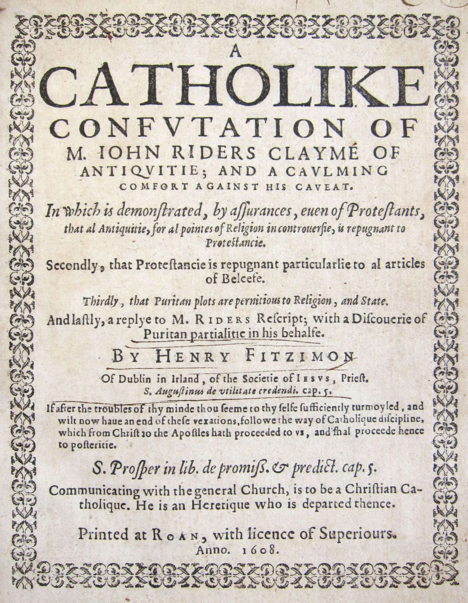 Henry Fitzsimons (1566-1643) devint protestant à l'âge de 10 ans. Né en Irlande, il fit ses études en Angleterre et à l'Université de Paris, où il fut converti au catholicisme et ordonné prêtre jésuite en 1587. Il rentra en Irlande en 1597, célébra ouvertement des offices catholiques et mit des ecclésiastiques protestants au défi de débattre avec lui. Son cousin protestant, James Ussher (1581-1656), se porta volontaire mais le principal adversaire de Fitzsimons était John Ryder (1562-1632), doyen protestant de la Cathédrale St-Patrick de Dublin.