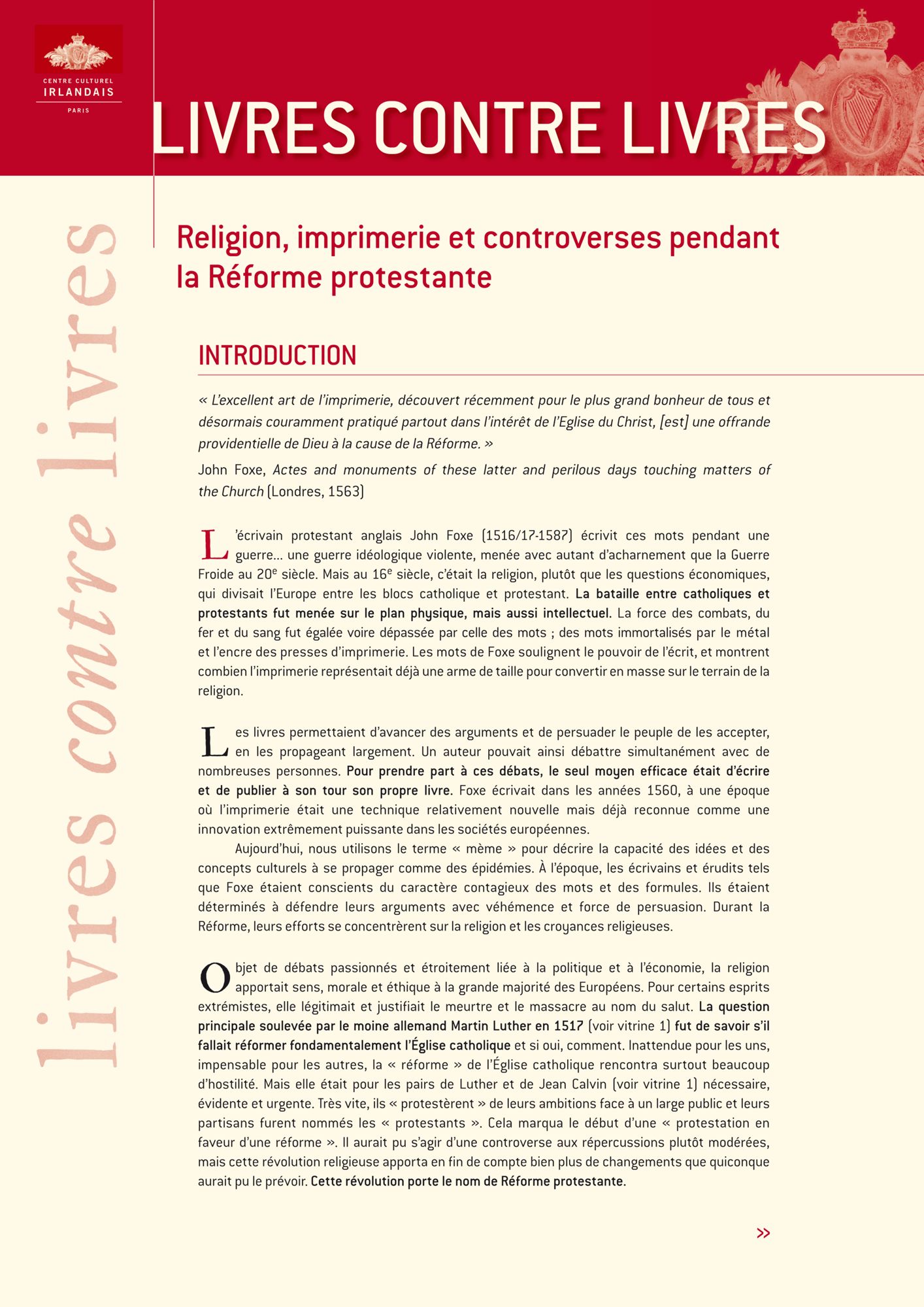 L'imprimerie joua donc un rôle de premier plan dans ce processus et nous transmit nombre des ouvrages conservés aujourd'hui au sein de la Bibliothèque Patrimoniale. Elle rendit possible une « guerre des mots », dont le riche héritage orne nos rayons. Parmi les collections de la Bibliothèque Patrimoniale du Centre Culturel Irlandais nous retrouvons de nombreux ouvrages majeurs retraçant une lutte intellectuelle intense, un conflit à la conquête des cœurs, des esprits et surtout des âmes, pendant la Réforme et dans son sillage. Du début du 16ème siècle et jusqu'à la fin du 17ème, les conflits, physiques et rhétoriques, étaient très violents. A partir du 18ème siècle, il était de l'avis général que la scission serait définitive mais des tensions bien ancrées, des discordes marquées et des controverses sporadiques subsistèrent longtemps après.