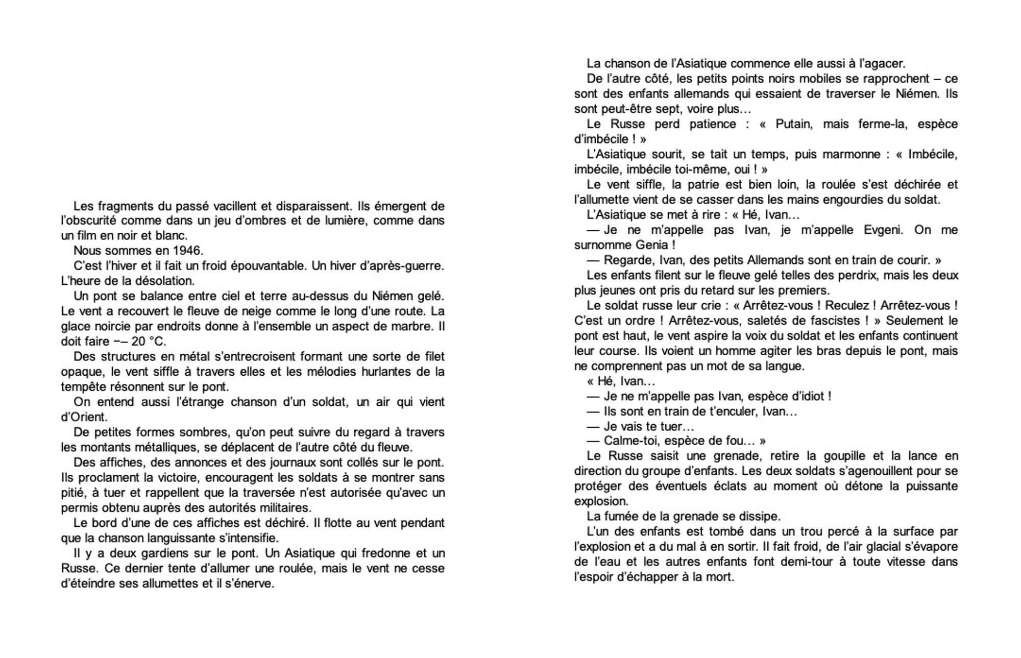 Elle était écrivaine. Elle écrivait des livres, avant. Mais où sont-ils à présent ? Qui en a besoin ? Qui pourrait bien en avoir besoin maintenant qu’il n’existe plus que le vent, le froid, la mort et la faim ? La flamme de la bougie vacille sous l’effet du vent. La tempête hurle, lèche les murs en bois de leur demeure. À l’intérieur il fait toujours froid, seul le poêle aide un peu, mais il faut sans cesse l’alimenter. On ramasse le bois dehors, dans le village. C’est le travail des enfants, toutefois ils sont si affaiblis par la faim que toute sortie est une épreuve. Sans compter les soldats et les nouveaux colonisateurs – la plupart blessés, traumatisés, commotionnés – qui vivent là à présent.