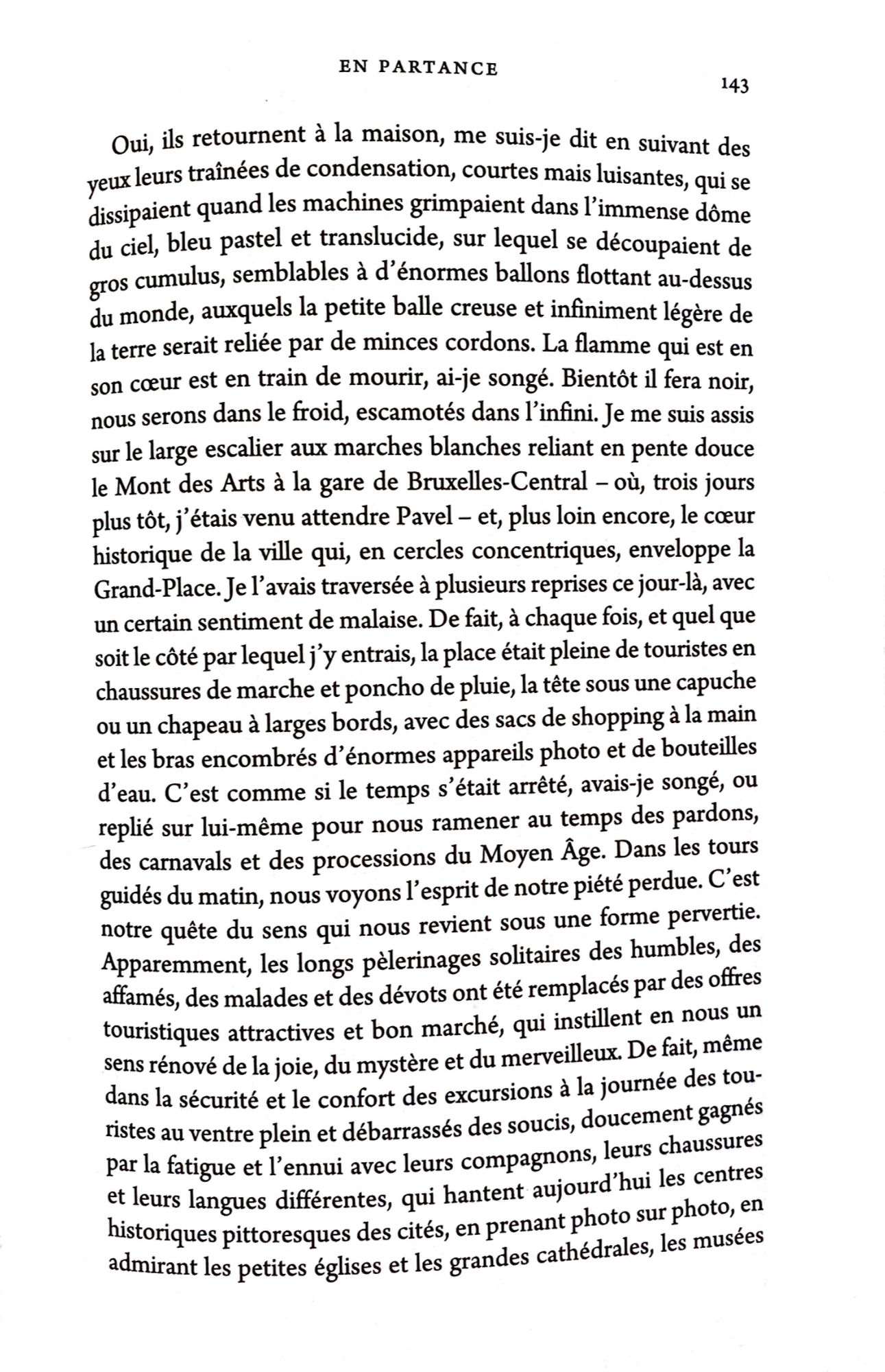 « En partance » est un récit « au fil des choses comme elles viennent », à la fois intime et universel, un travelling panoramique lent et méditatif à travers notre Europe : il commence à sa pointe occidentale, à Galway, au cœur de l'orage et des pluies battantes, puis passe par Bruxelles, Gand et Ypres, pour finir à Sarajevo et Mostar, le tout marqué par les émanations mémorielles des champs de batailles anciennes et récentes. De lieu en lieu, le narrateur tombe sur des exilés ayant fui les guerres yougoslaves qui s'empoignent avec leur nouvelle réalité. Le résultat est envoûtant de polyphonie, rempli de nostalgie et de mélancolie, mais aussi des détails cocasses et des pointes d'ironie. Le livre est illustré de photographies en noir et blanc prises par l’auteur.