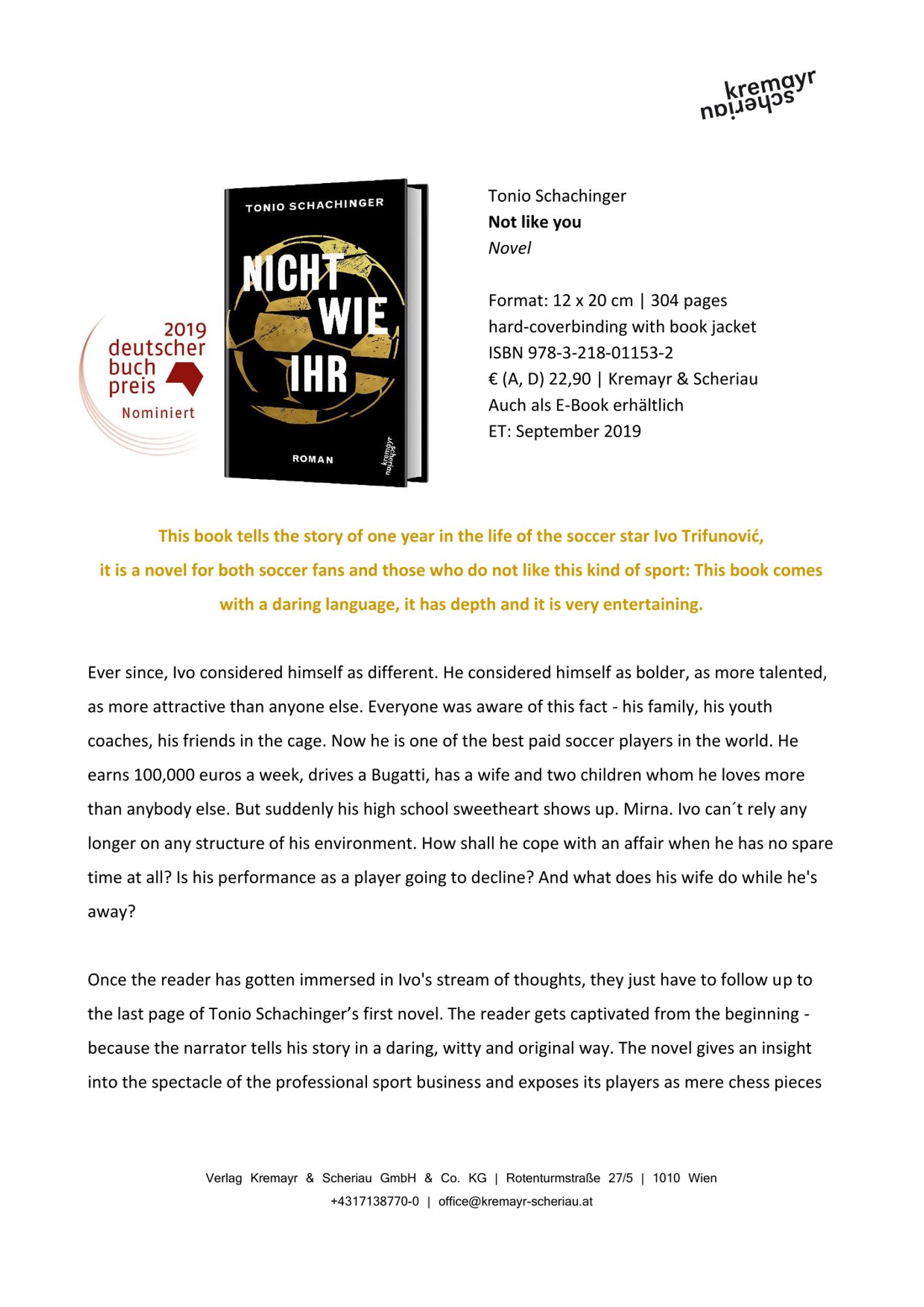 Schachinger brosse un tableau captivant du monde du football professionnel, tout en en dévoilant les aspects les plus sombres. Il aborde des thématiques telles que le racisme quotidien, la pression immense exercée sur les joueurs et le langage manipulateur des médias. Avec justesse et perspicacité, il invite ses lecteurs à une réflexion sur les relations interpersonnelles et la société actuelle. (Nominé au Prix du livre allemand 2019).